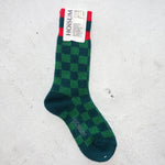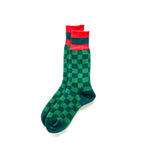 Checkered calf-length with contrast stripe ribbed cuff in pink and turquoise pattern. The Ichimatsu checkered pattern is a traditional Japanese design that has been used for centuries—symbolizing prosperity and hope.