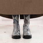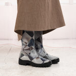 Silver and gray calf length boots with Vibram sole in diamond check lenticular print.