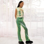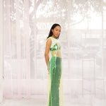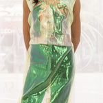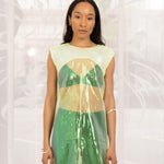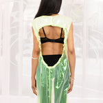 Sheer sleeveless yellow/green iridescent long straight dress with circular and adjustable back cutout. Drawcord cinch allows for sizing to be adjustable. Back slit.