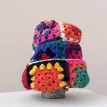 Primarily 100% wool yarn with some cotton yarns. Sewn together with acrylic yarn.