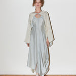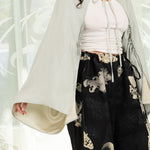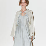 Flowy cropped satin shrug made from deadstock charmeuse. Tie closure at front with ruffled sleeve seam detail.