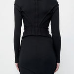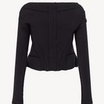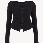 Stretch cotton ribbed square neck cardigan with exposed seams in fitted corset style; button and loop closures.