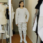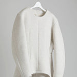 YOHEI OHNO's signature silhouette is used in this cardboard jersey top. The intention was to create a sculptural silhouette that is comfortable to wear. It is characterized by the roundness and space around the shoulders and the waist shape leading from there. One of this season's “sculptural relaxed wear” concept series.