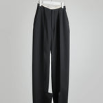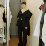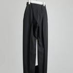 The "Church" trousers are Yohei Ohno's signature pant silhouette of the season. The style is designed so that the toe of the shoes peek out from the slit at the overhanging square hem, named as such as the design resembles the entrance of a church. The shape is slightly thicker, straight silhouette. The material used is wool twill with a resin finish and a taut feel.