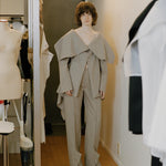 The "Church" trousers are Yohei Ohno's signature pant silhouette of the season. The style is designed so that the toe of the shoes peek out from the slit at the overhanging square hem, named as such as the design resembles the entrance of a church. The shape is slightly thicker, straight silhouette. The material used is wool twill with a resin finish and a taut feel.