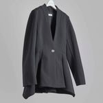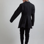 This is an oversized version of the women's jacket presented as the uniform for the “Sumitomo Pavilion” at Expo Kansai, Osaka. It features large pleat like wings. The sculptural shape is achieved with a scuba material that is firm and taut.