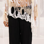 Oversized loose knit jumper with wide neck, asymmetrical opening and loose bell sleeves.