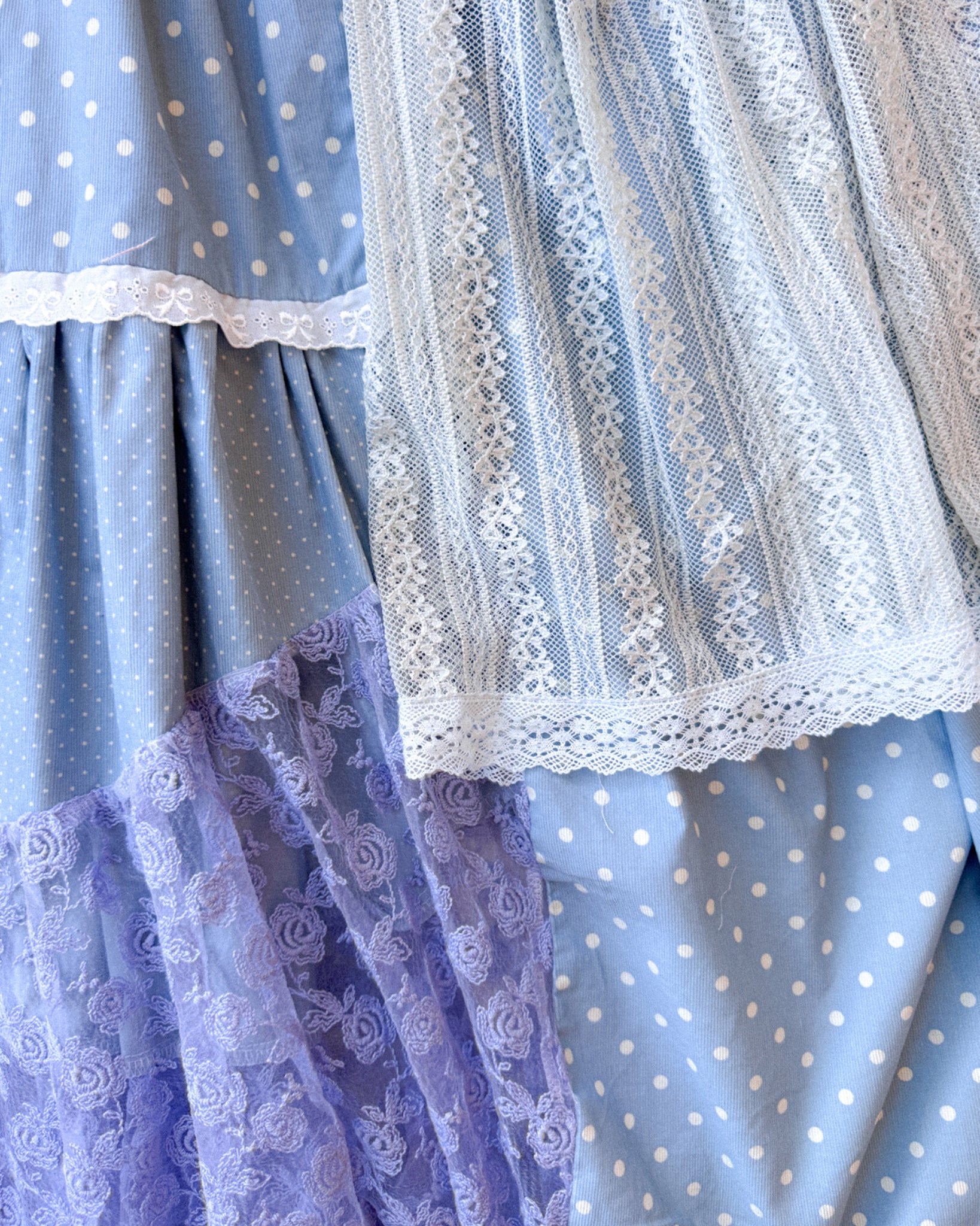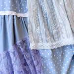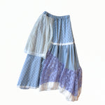 Patchwork skirt crafted from contrasting panels of lightweight woven fabric. Features an elastic waistband, uneven hem, and fluid movement. Each piece is unique in composition.