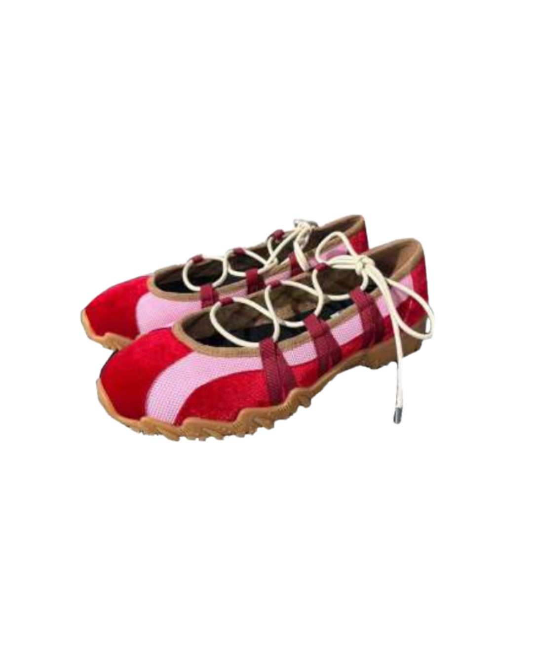 Red and pink color block sneakers with rubber sole and open front lacing. Lightweight with soft cushion insole and comfortable for everyday wear.