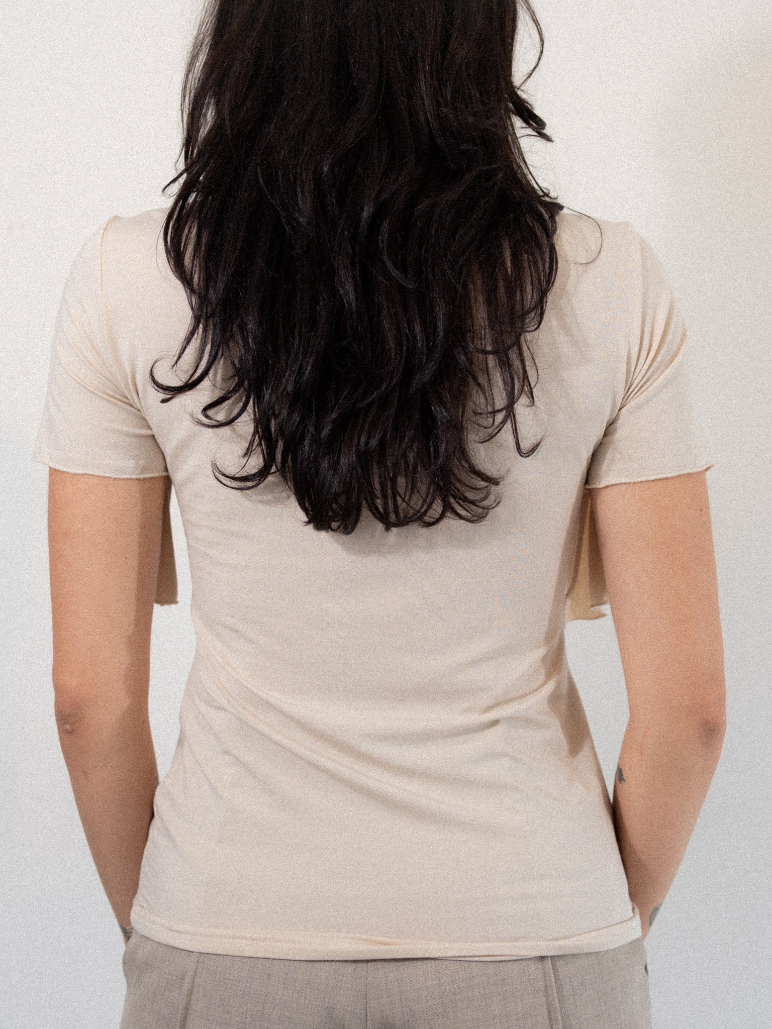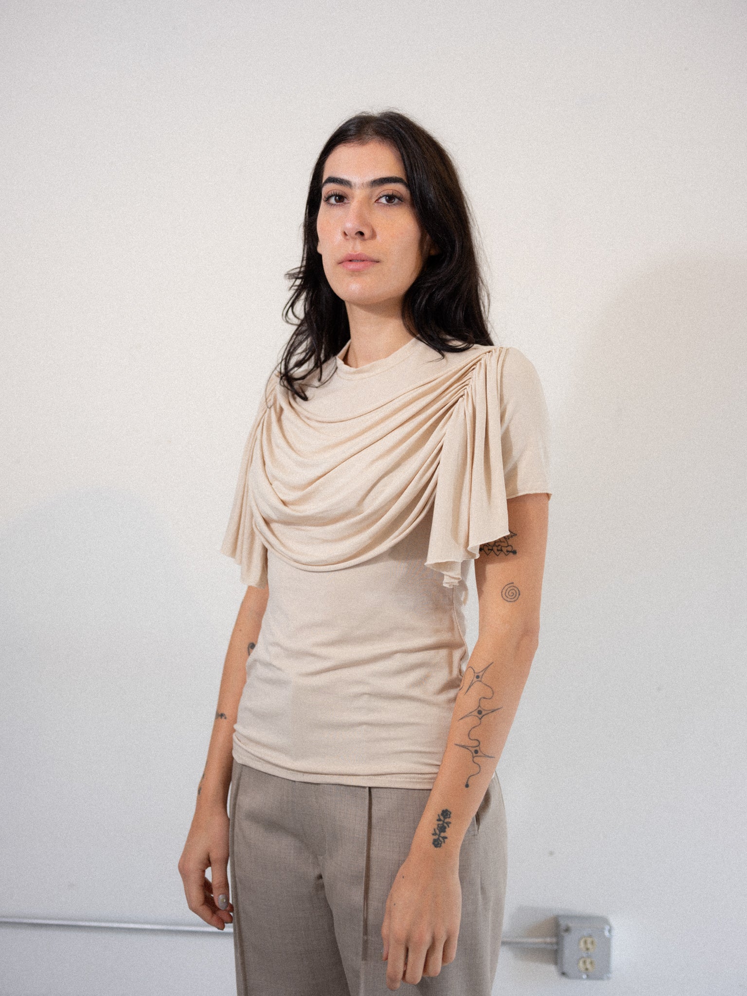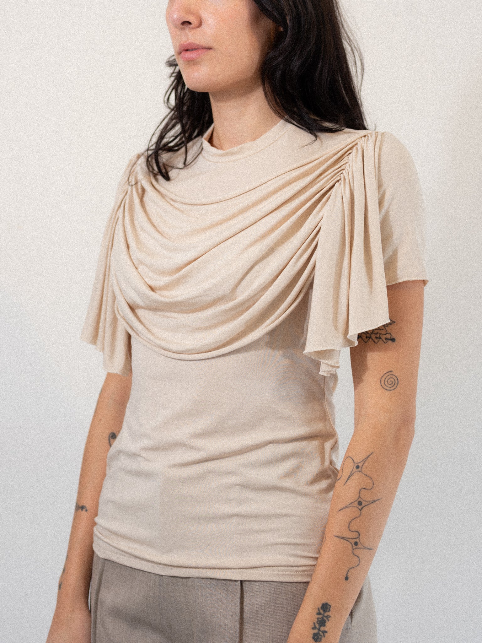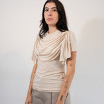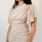 This drapes stretch t-shirt in ecru is a signature look of Anne Isabella’s aesthetic across collections. Made from stretchy Lyocell for a versatile fit and soft feel. Round neck with draping details across the front of the chest.