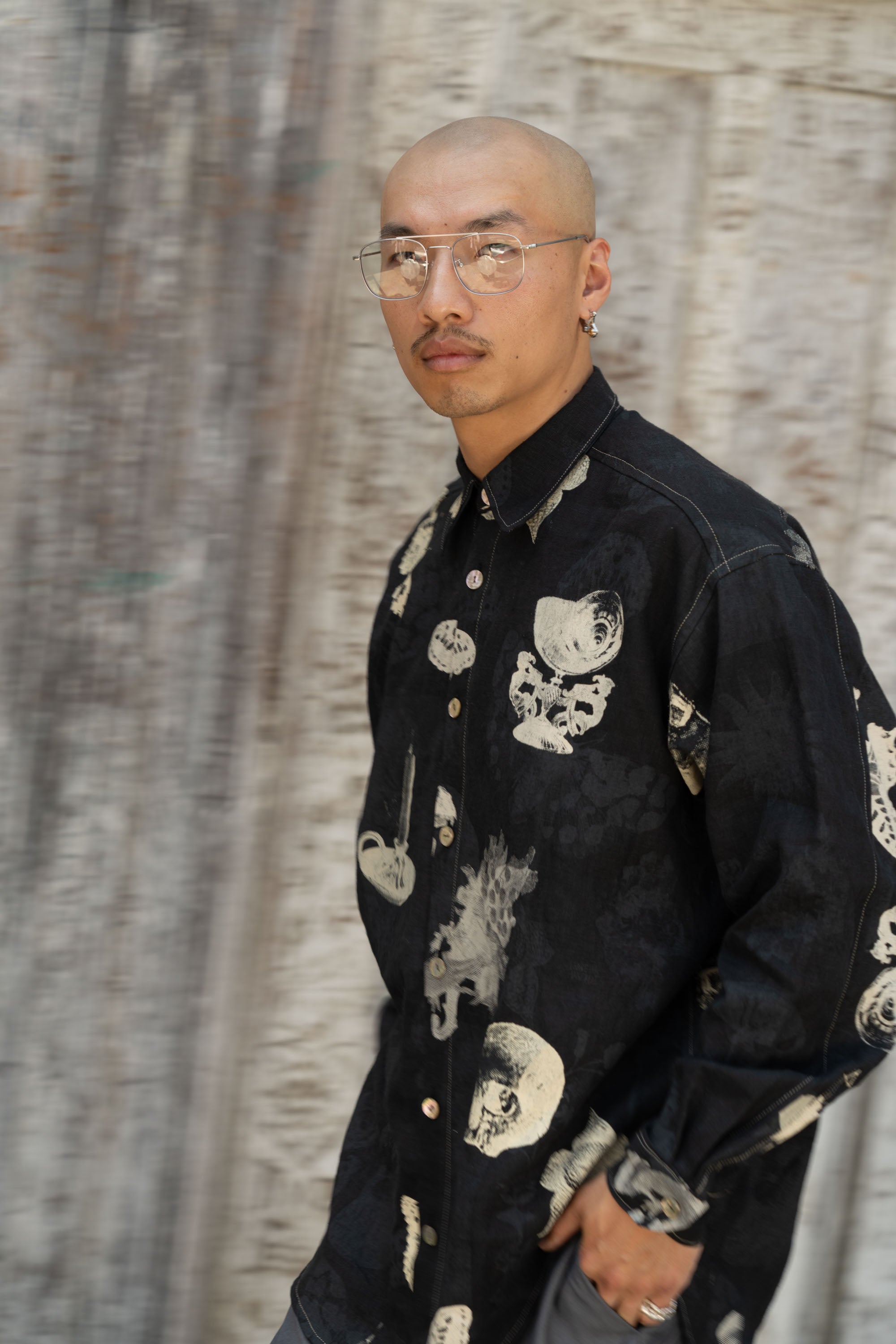 Black linen shirt featuring dual tone hand screen print of nature motifs, layered for subtle pattern play. Contrast white stitching and shell buttons.