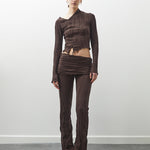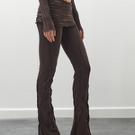 Fitted, mid-rise waist pants with a built-in mini horizontal skirt detail (non-removable) with side gathers. Unique handmade suture formation on each item.