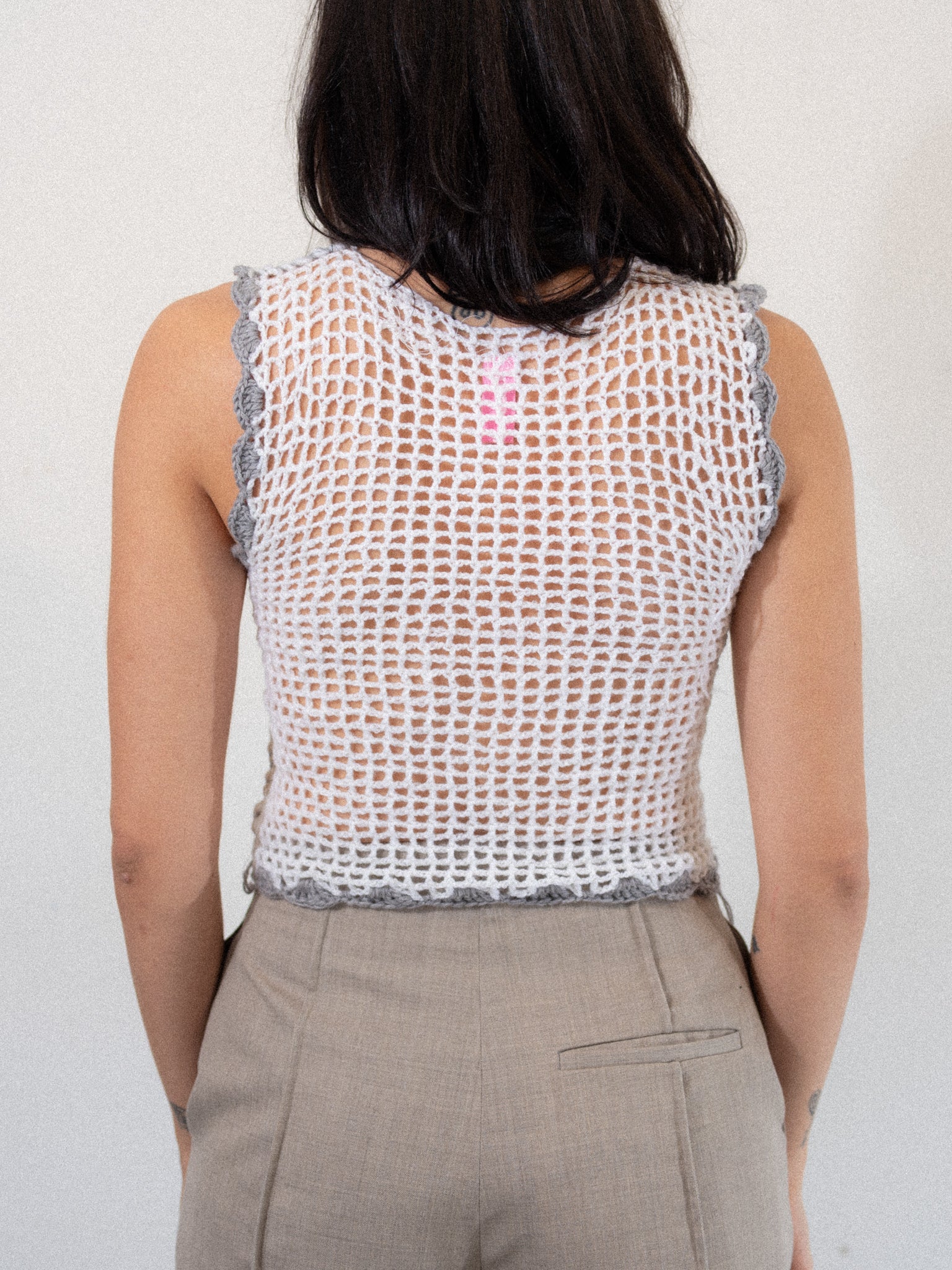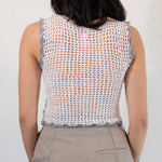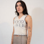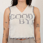 Knit v-neck sleeveless vest in white and cream with crocheted gray scallop trim. Lettering says "GOODBYE". Back features open knit. Loose thread details. Designed for layering over shirts or dresses, creating dimension and light play.