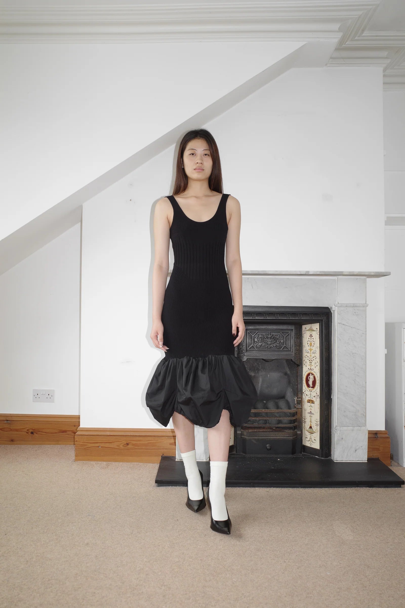 Fitted knit long dress with flower-shaped adjustable hem.