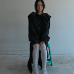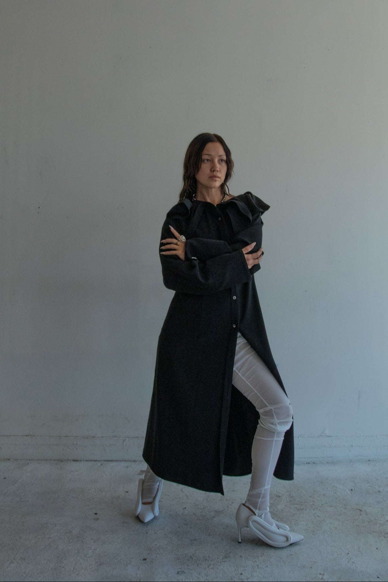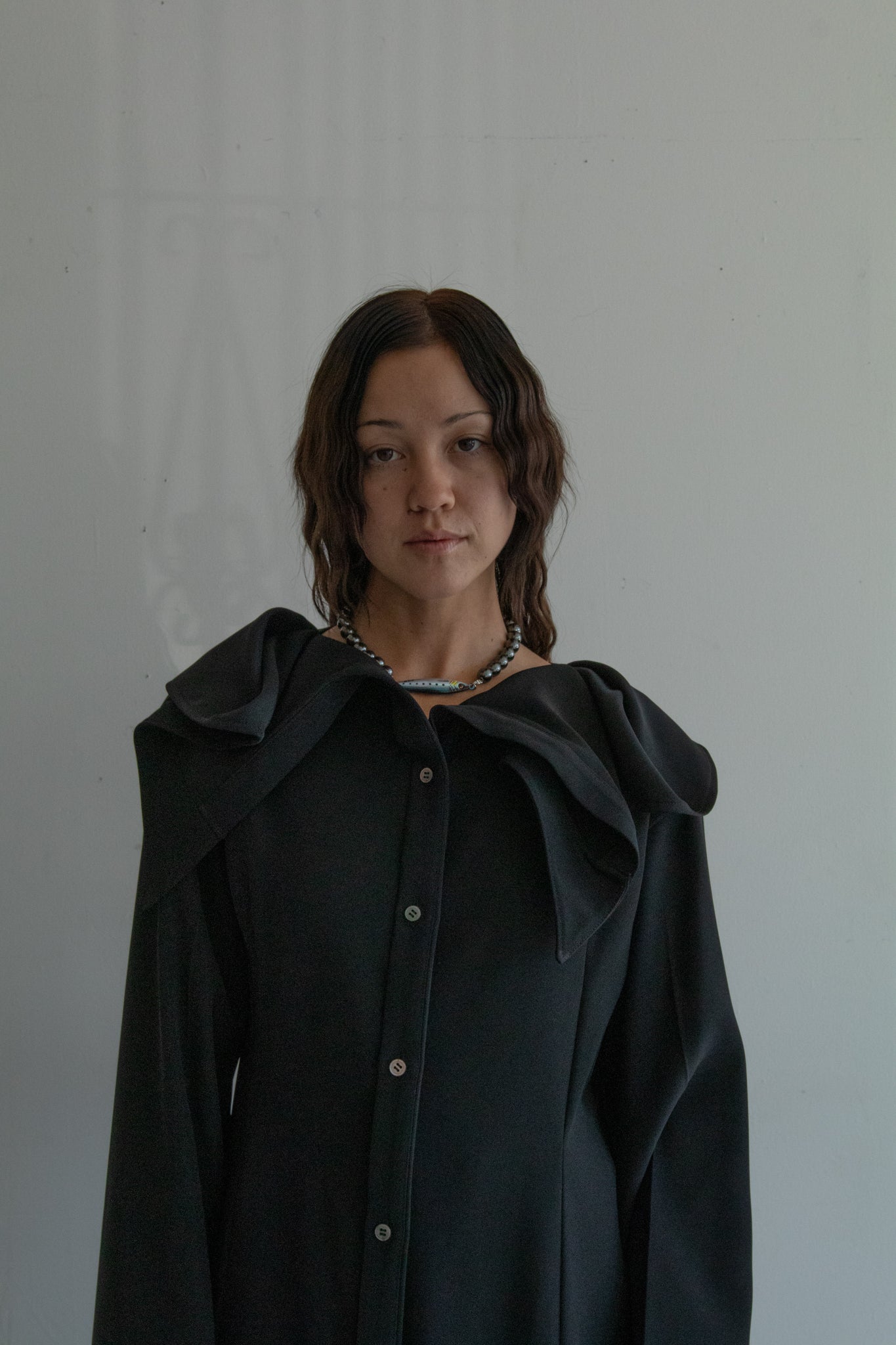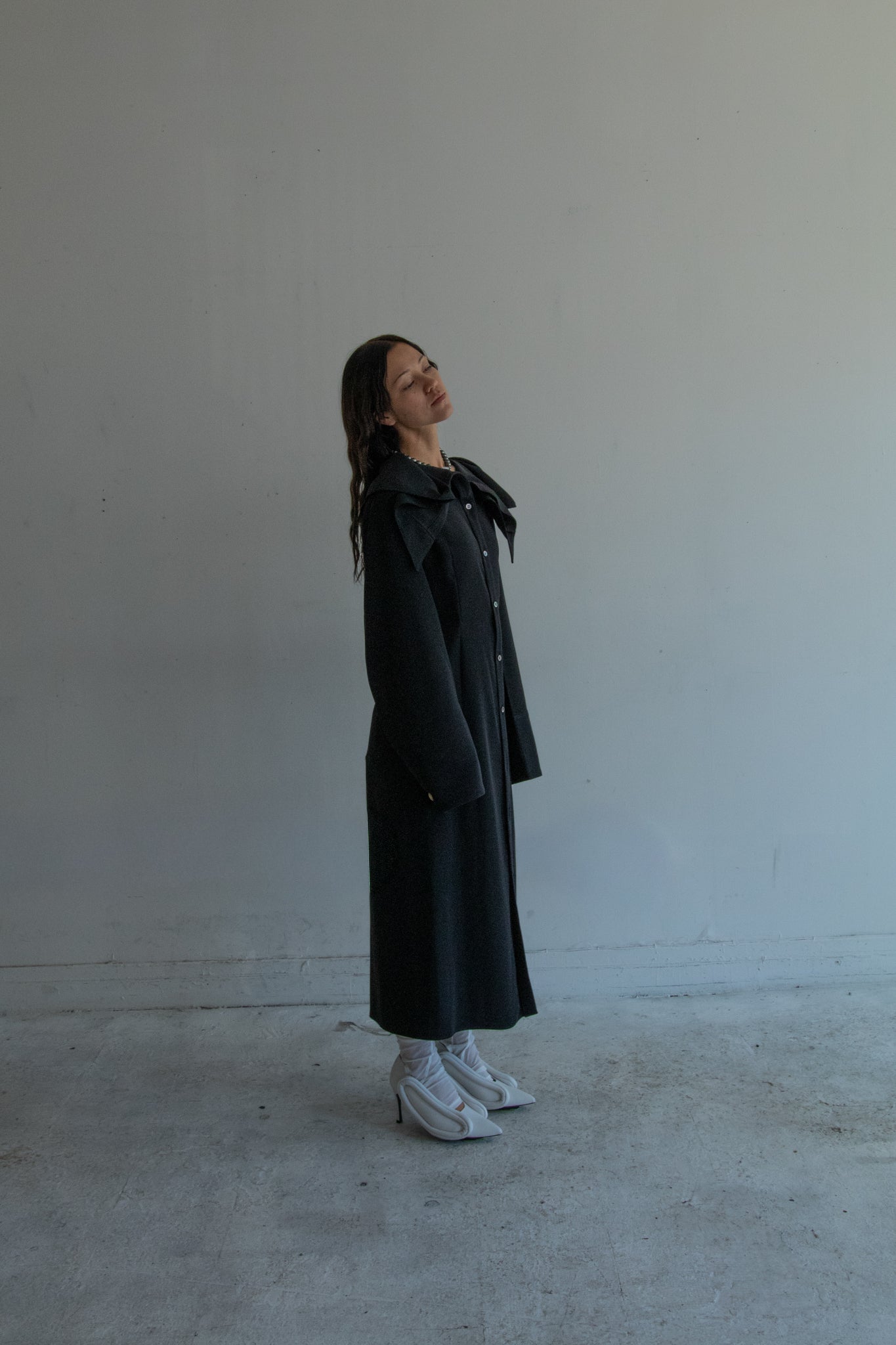 This shirt dress was born from this season's new modeling idea of “attaching sleeves to a square piece of cloth. The blank space created by leaving the square shape of the cloth as it is became the unstable and large swinging collar. The viscose/wool fabric is intended to give an elegant impression with a sense of fall. For the cuffs, vintage buttons of limited quantity were used.