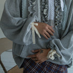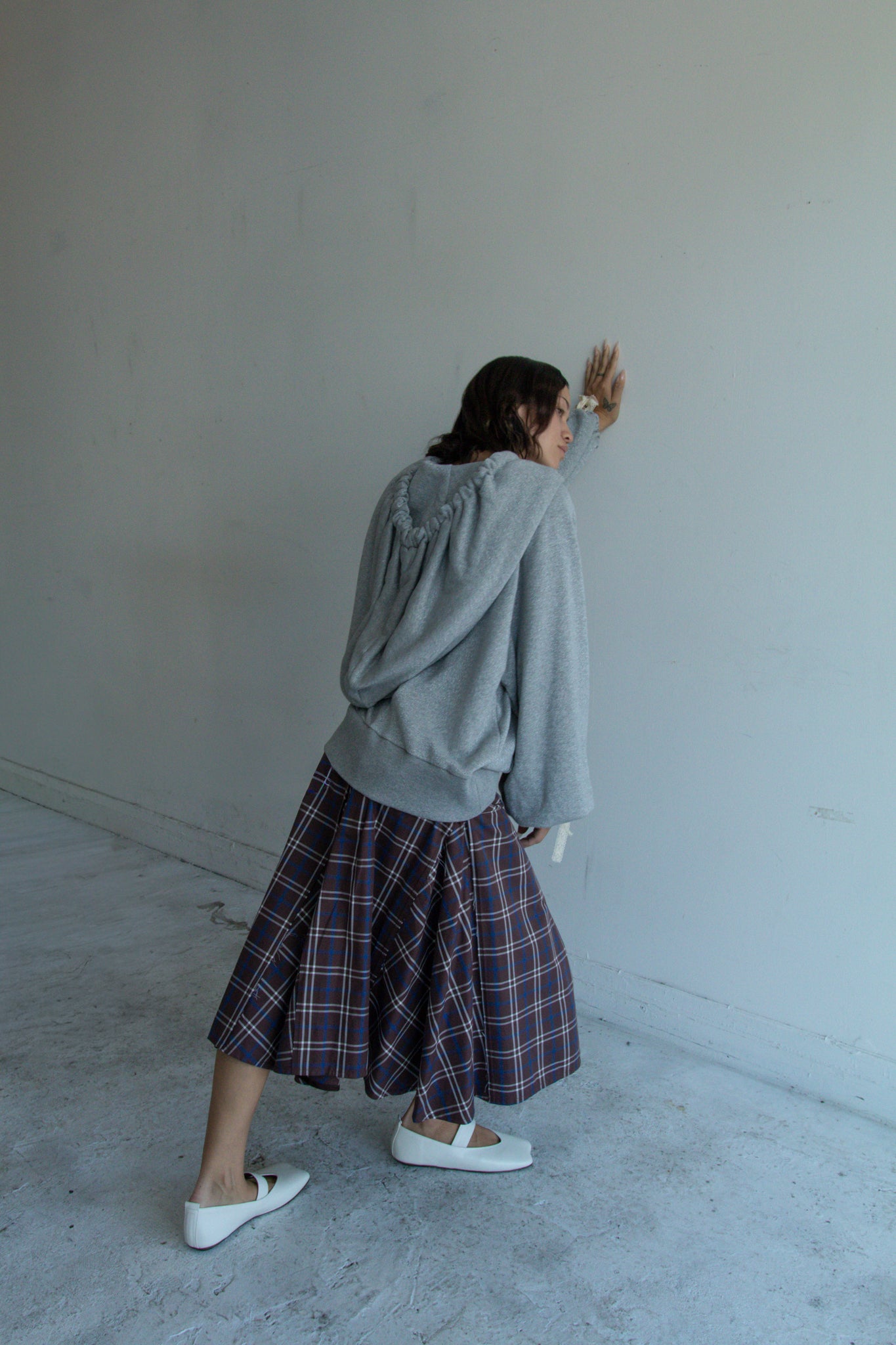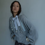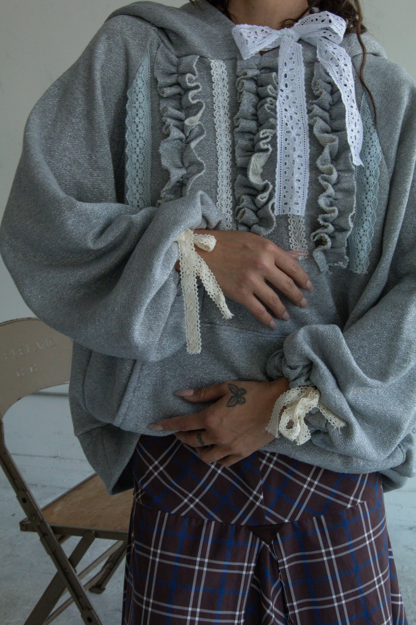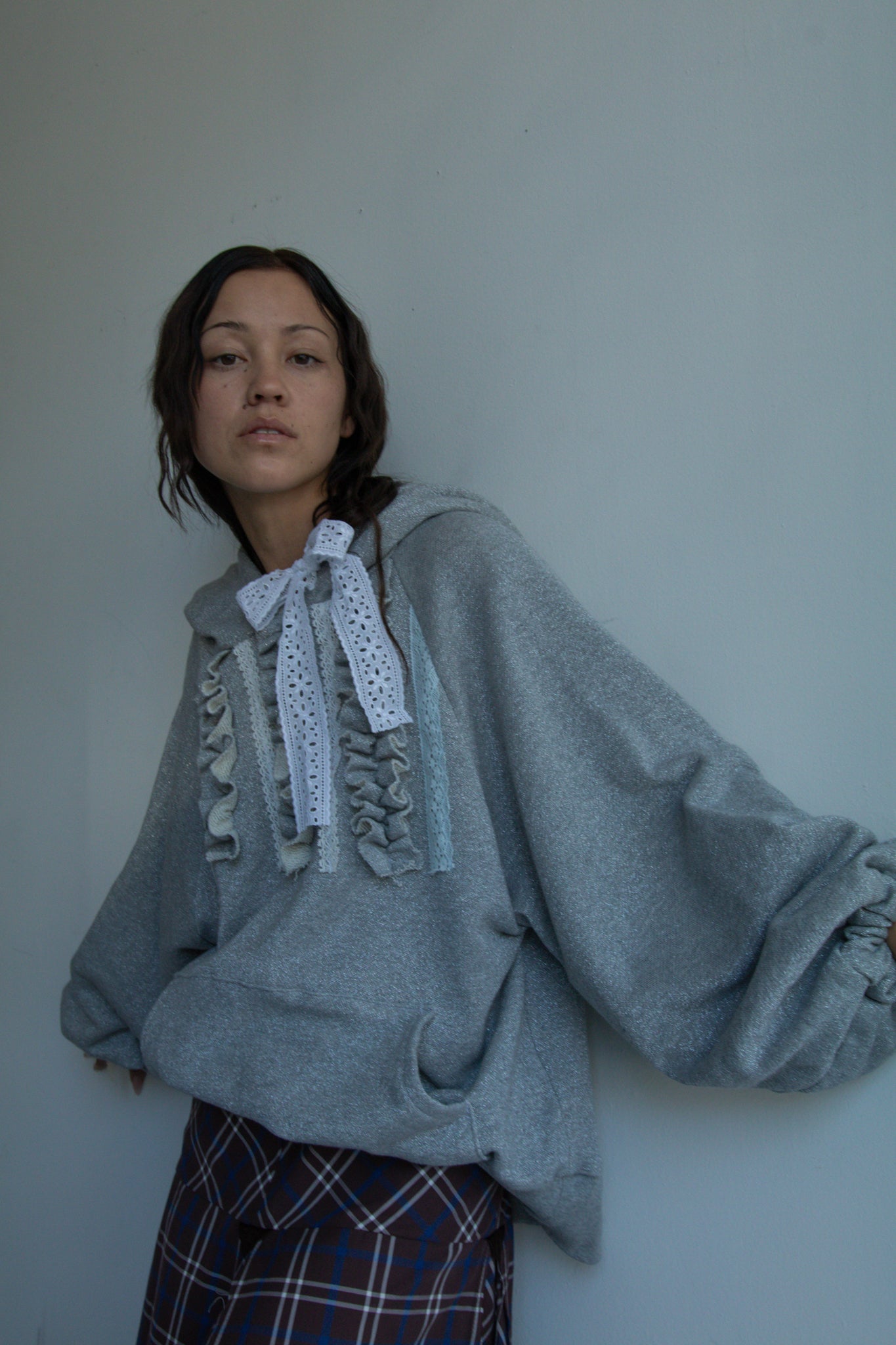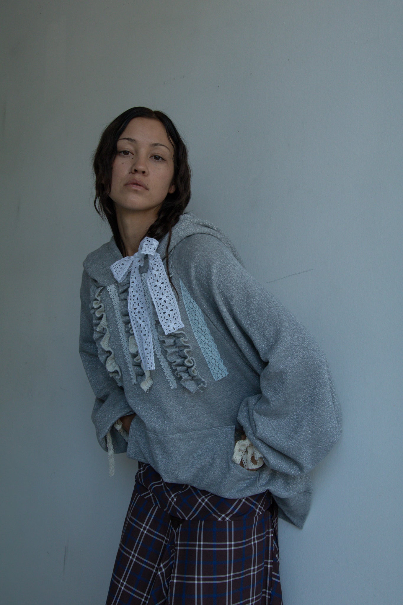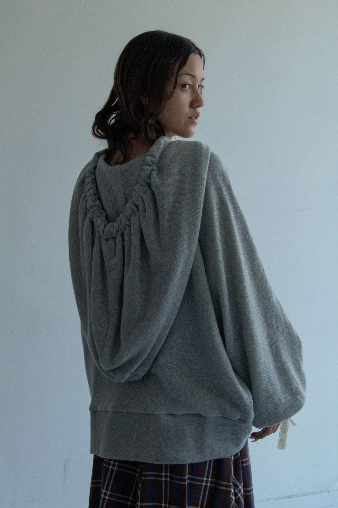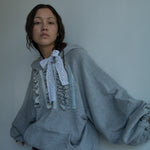 Relaxed, slouchy gray hoodie with extra oversized hood and front chest detail. Ribbon cuffs and drawstring closure. Unisex and easy to wear, with a sculptural sense of comfort.