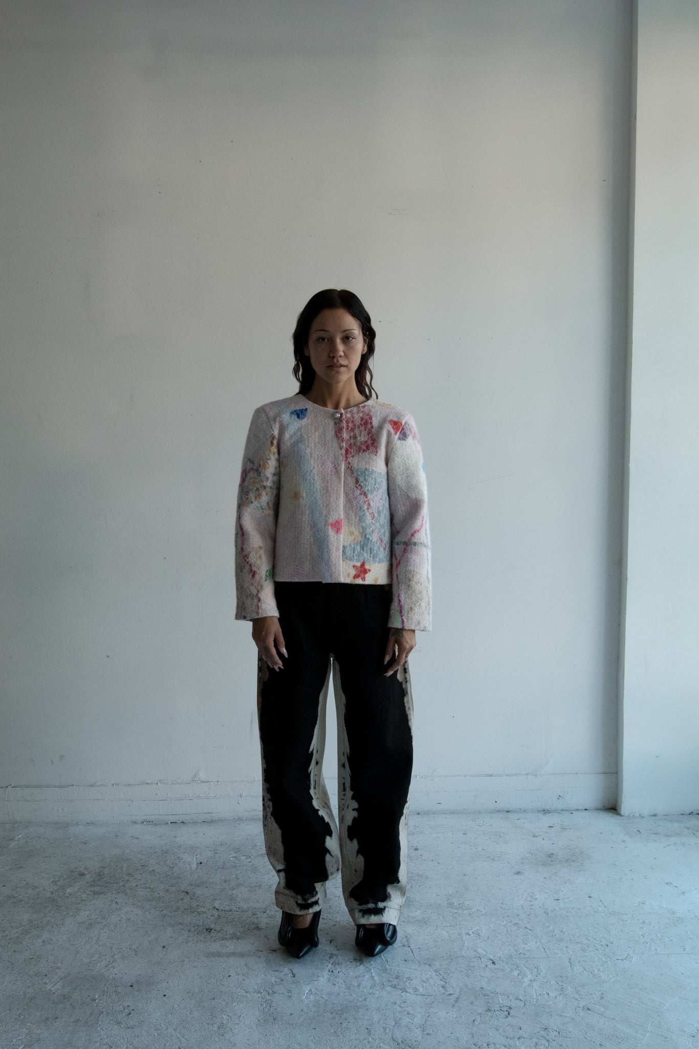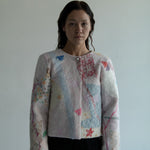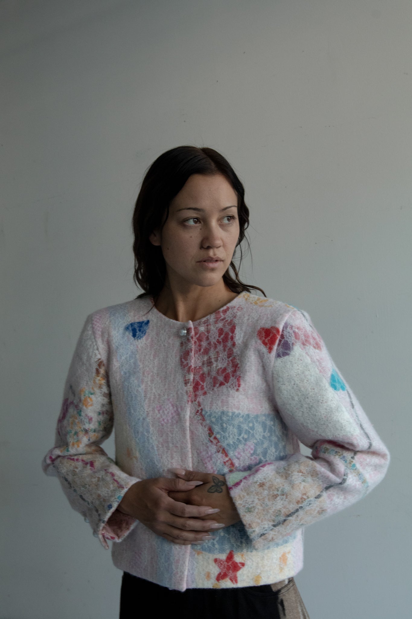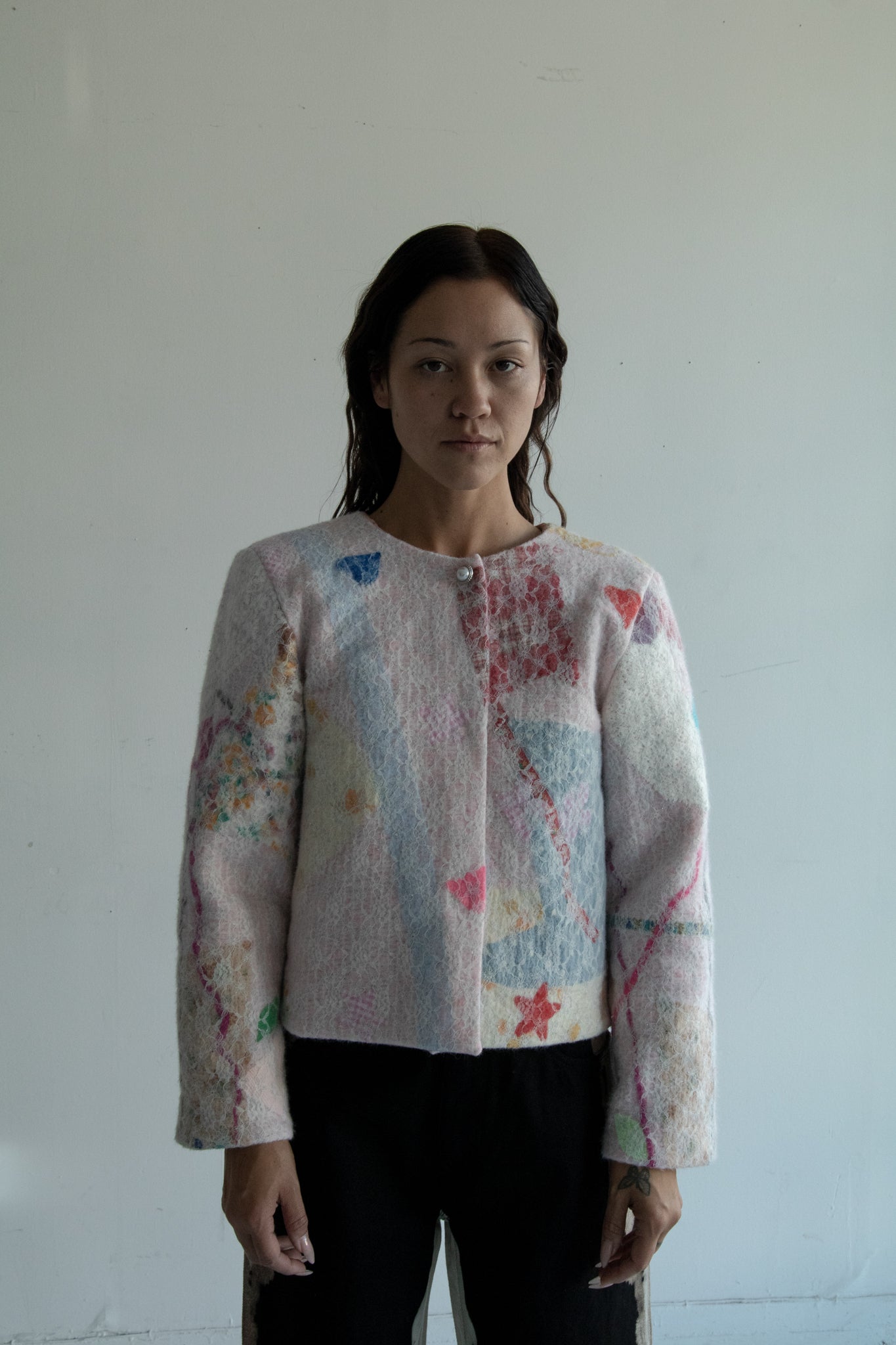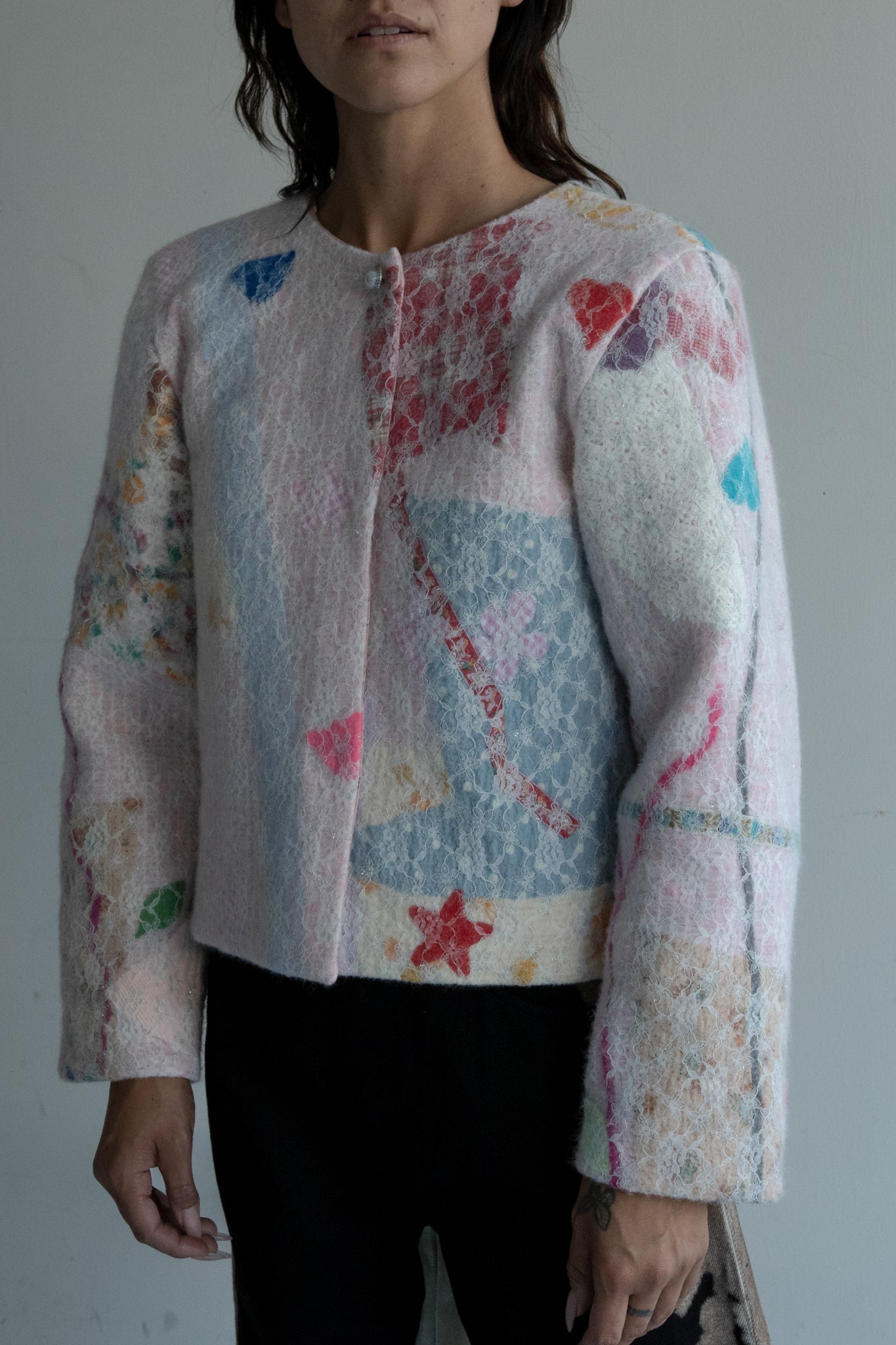 Lightweight wool and lace felted crop jacket, full lined. Ornate button closures.