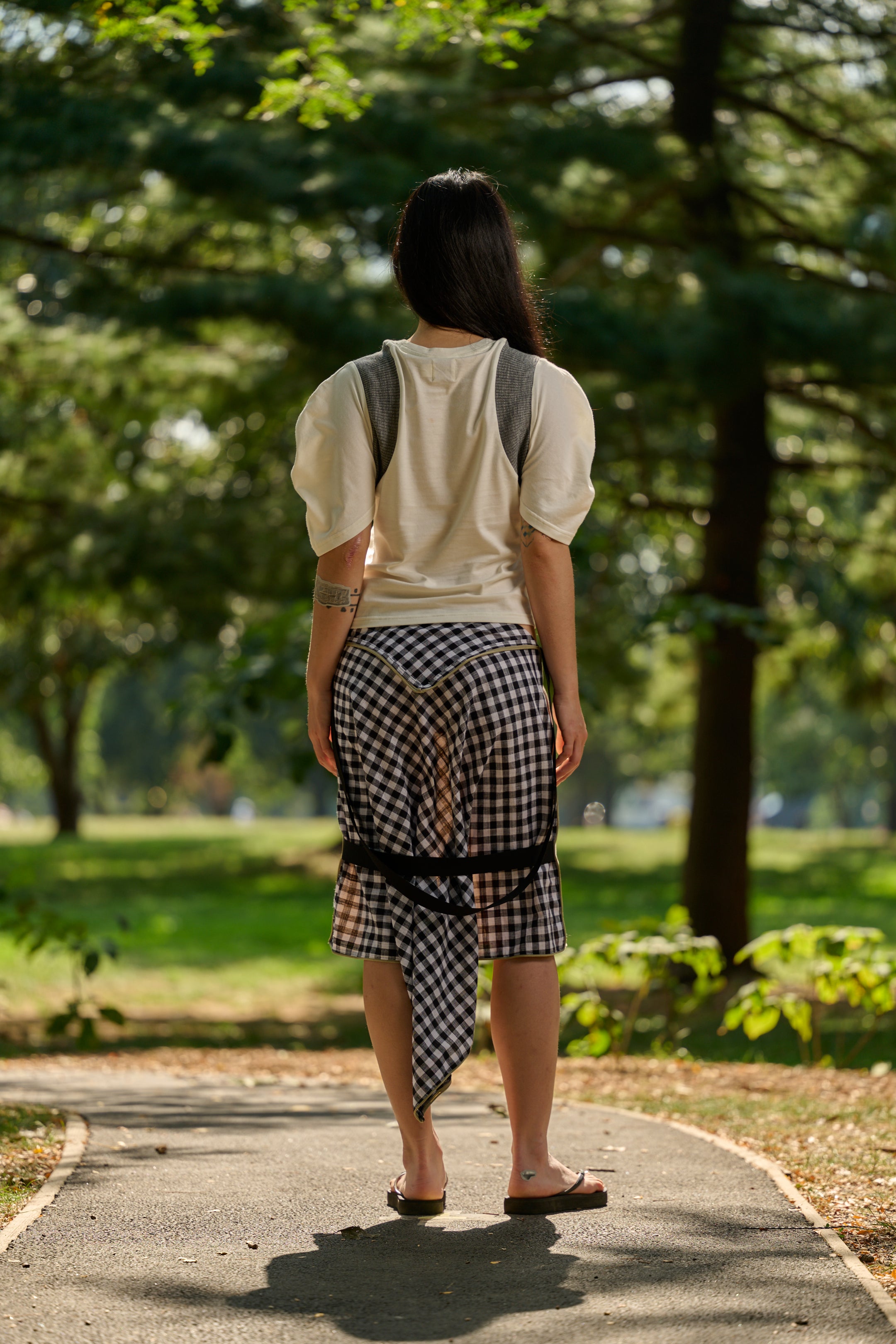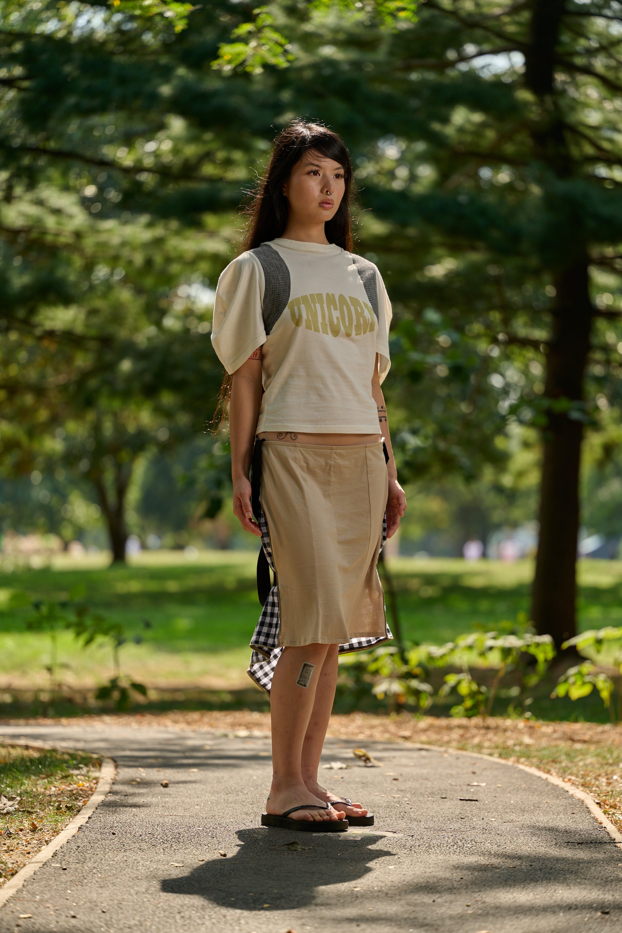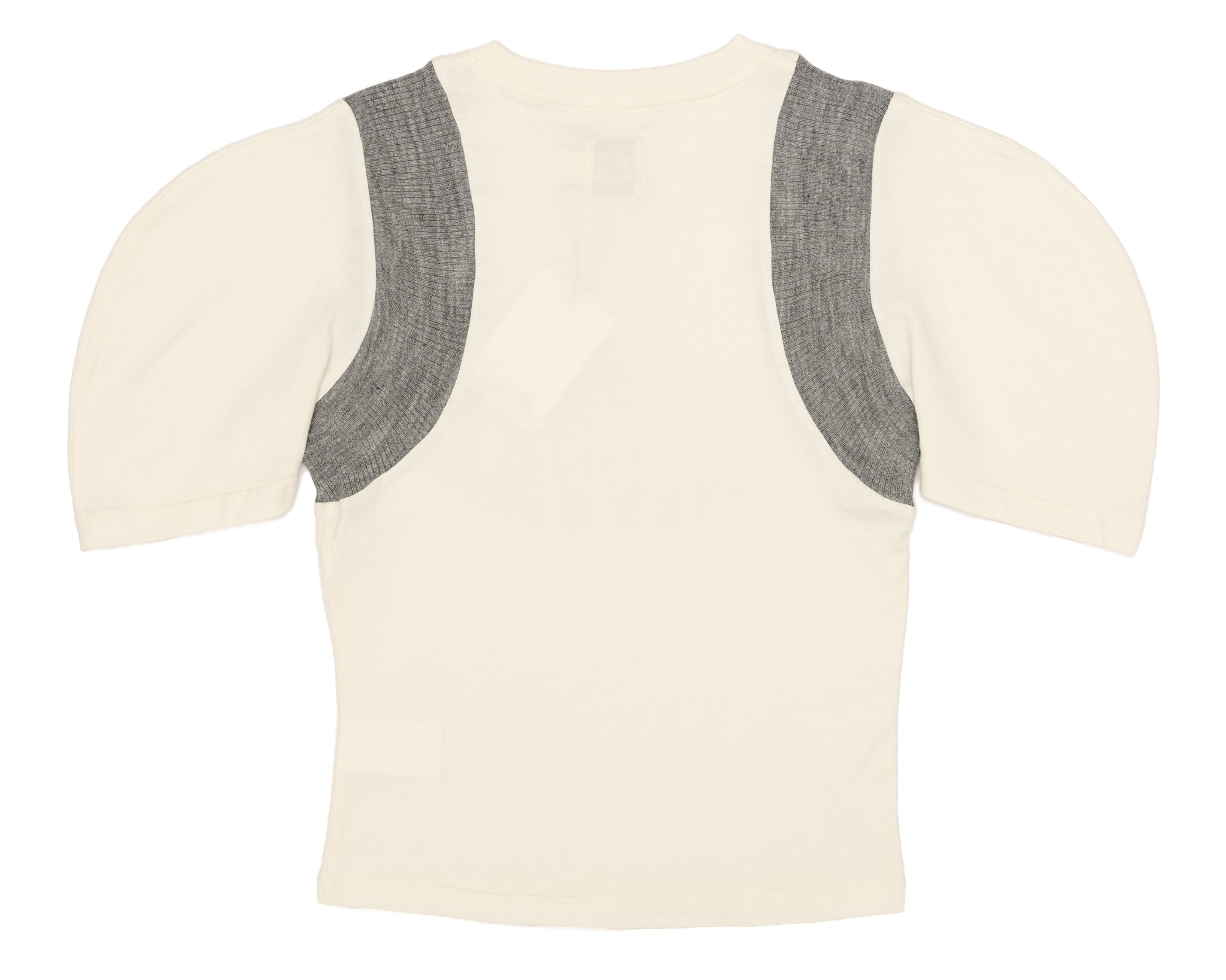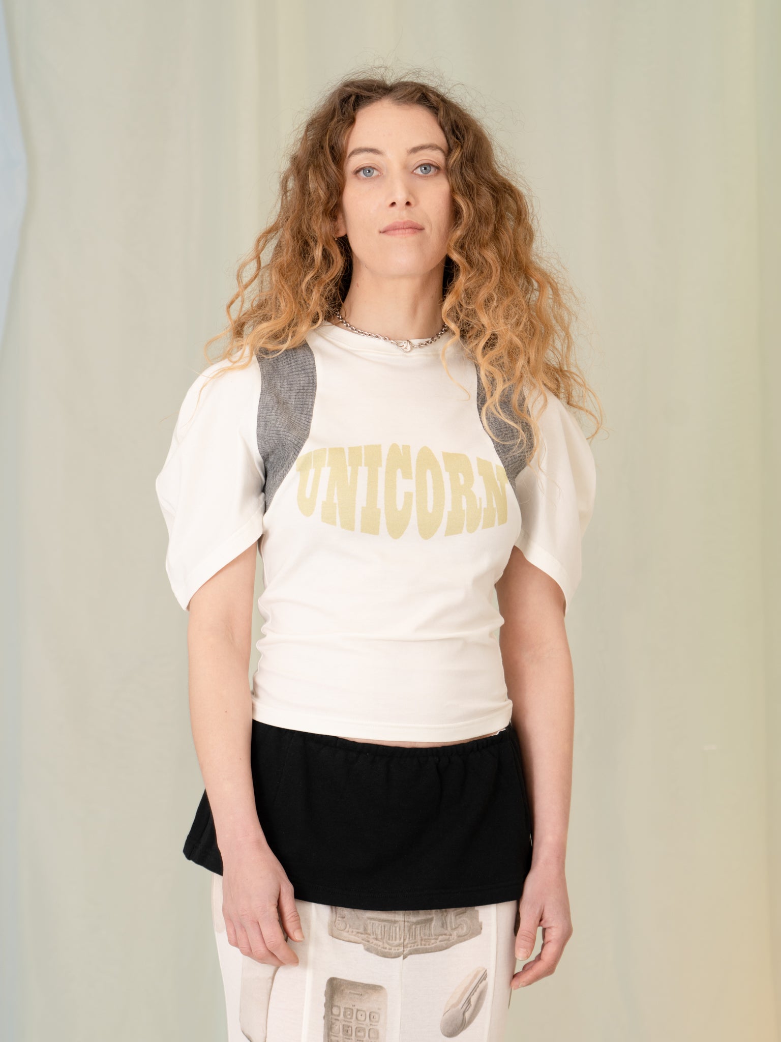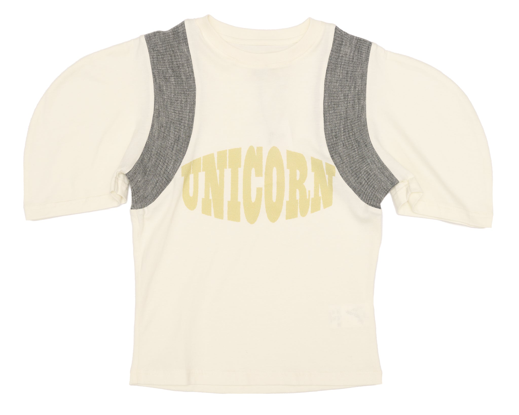 Ivory t-shirt with UNICORN print; exaggerated curved sleeves—like a football jersey. Gray wool rib band.