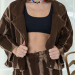 ロサンゼルスで作られ、手染めされたクロップド丈のオーバーサイズボクシージャケット。 4つのジッパー付きユーティリティポケットとタックボタン開閉が付いています。