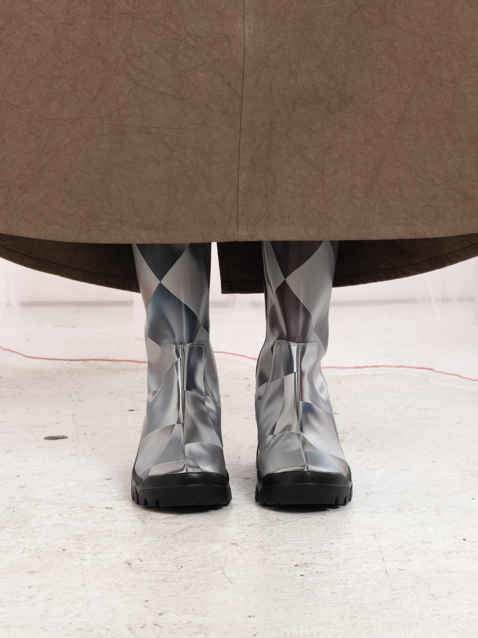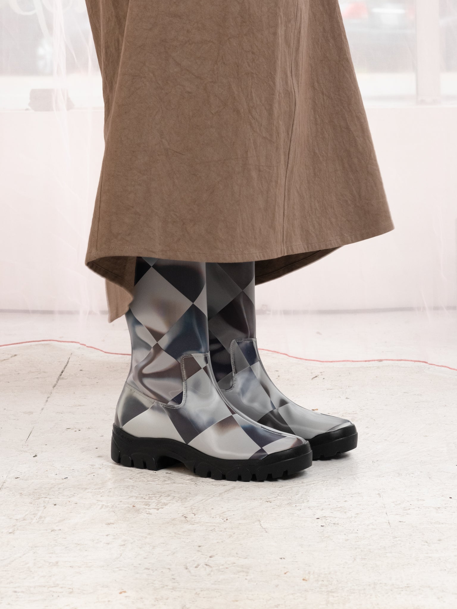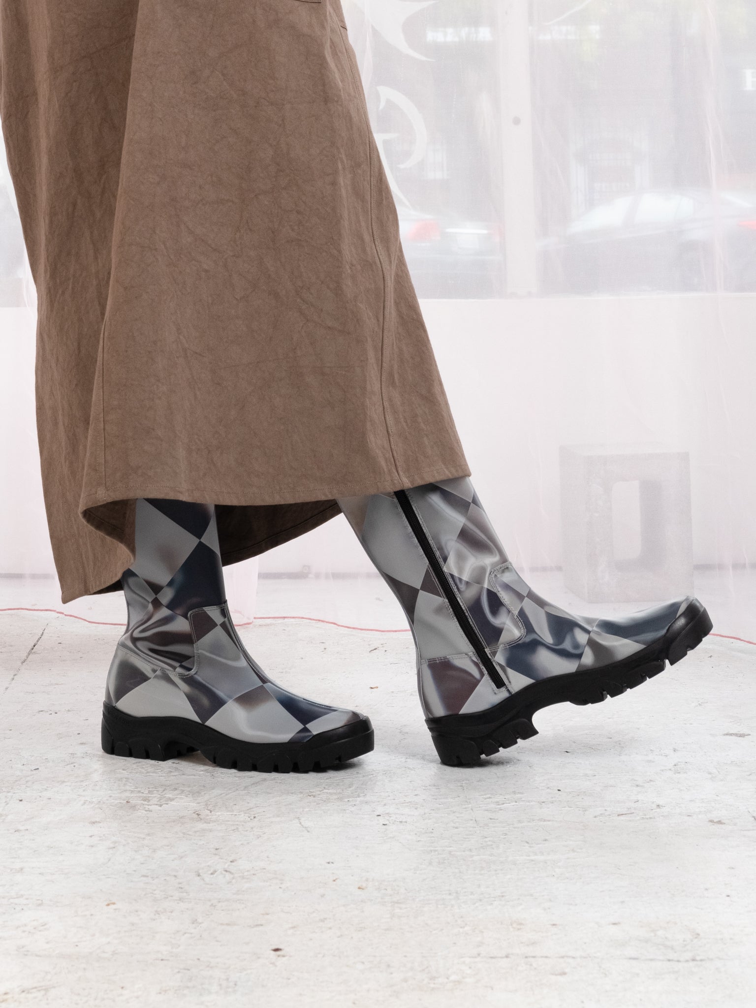 Silver and gray calf length boots with Vibram sole in diamond check lenticular print.