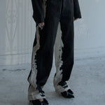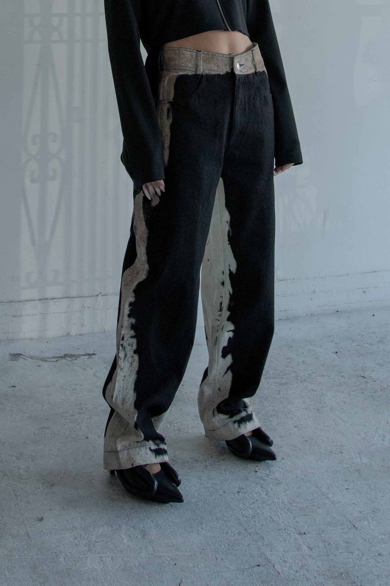 A riff on the classic high waisted fit with wide leg. Hand painted bleach that outlines, creating length and dimension. Each pair is painted by hand with unique variations to the design. Unisex.