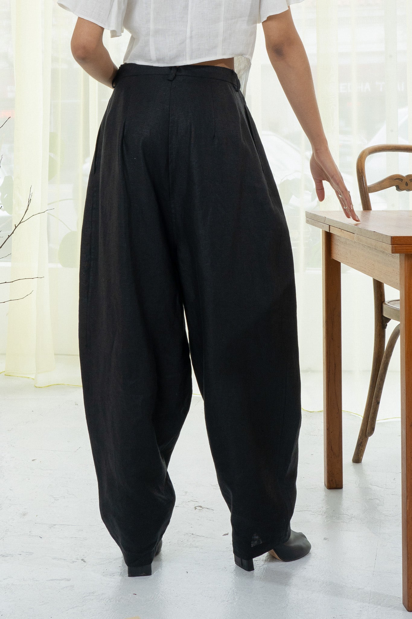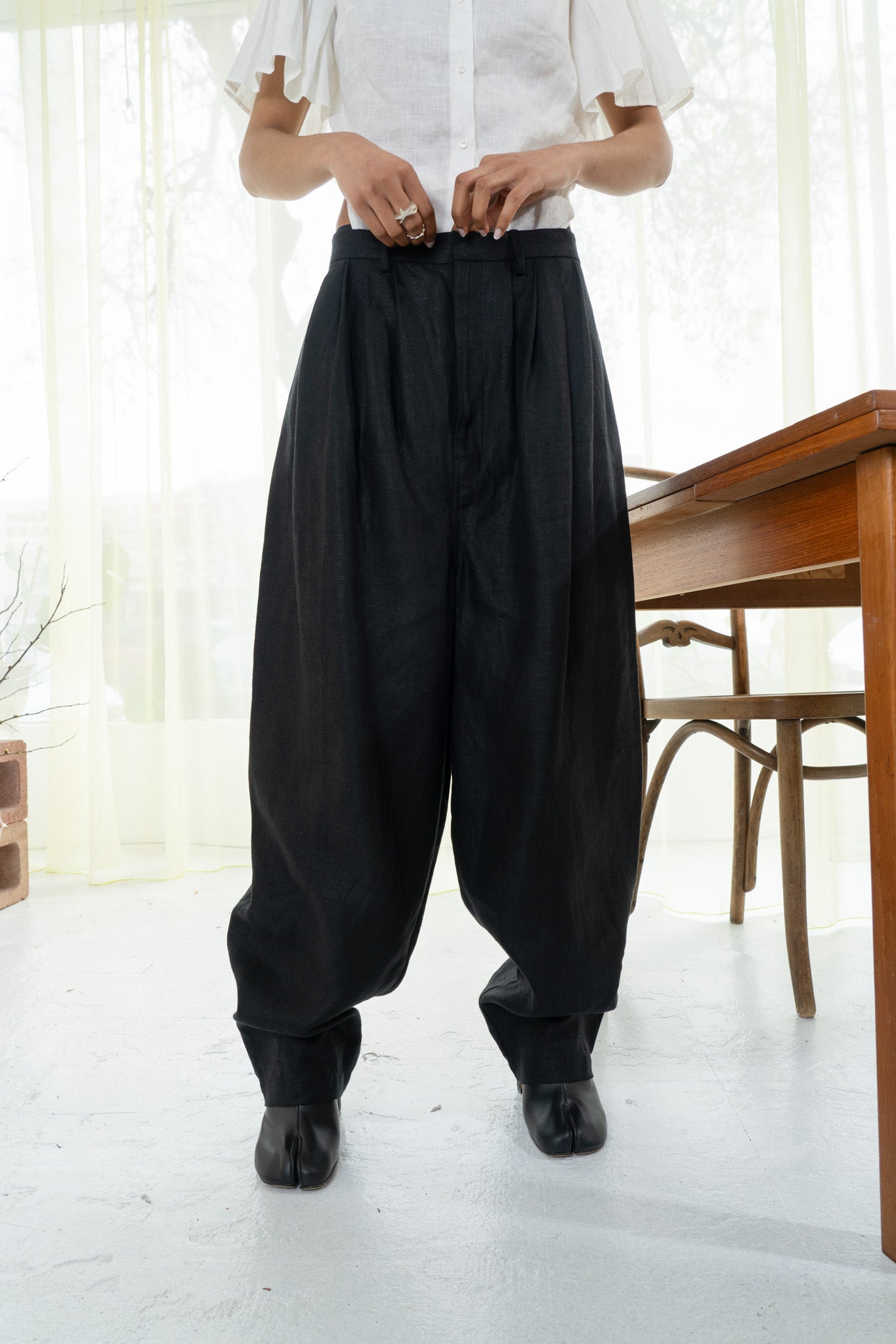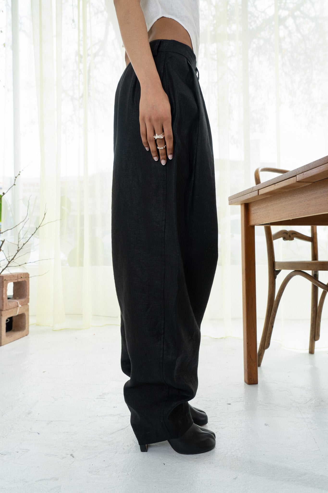 Pleated trousers made from 100% Irish Linen, wide leg fit that tapers just slightly at the bottom. Can be worn at natural waist or low waist.