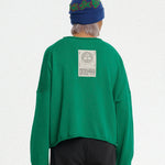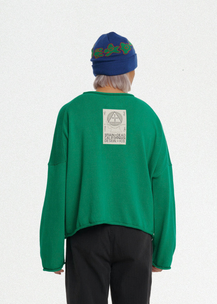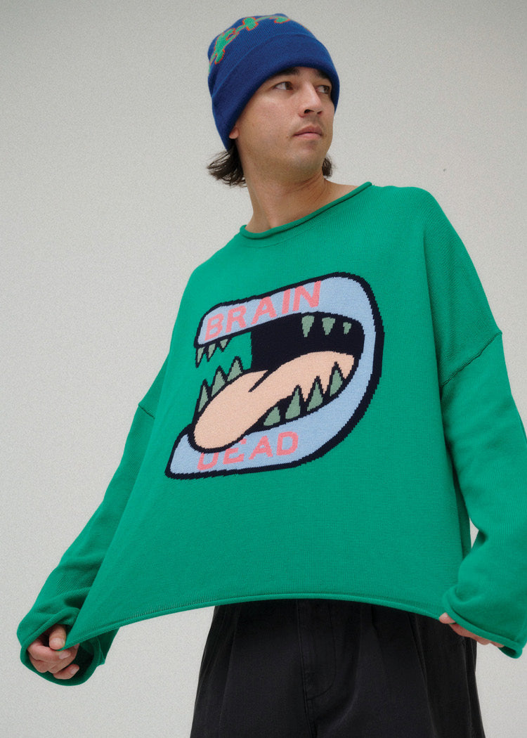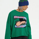 Oversized green cropped sweater with oversized big bite graphic on the front and patch on the back.