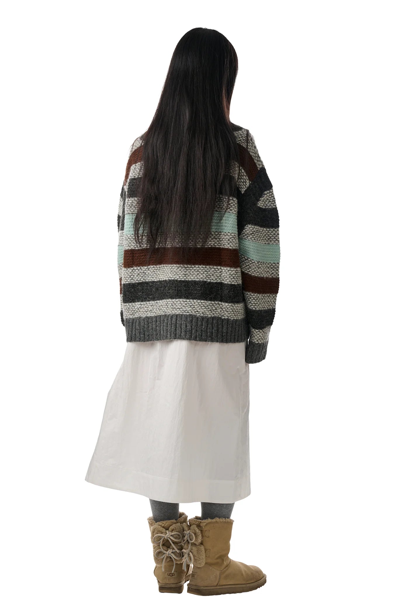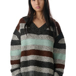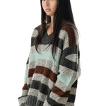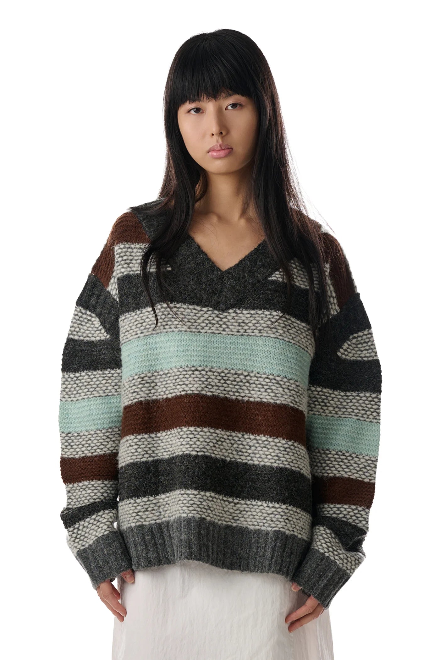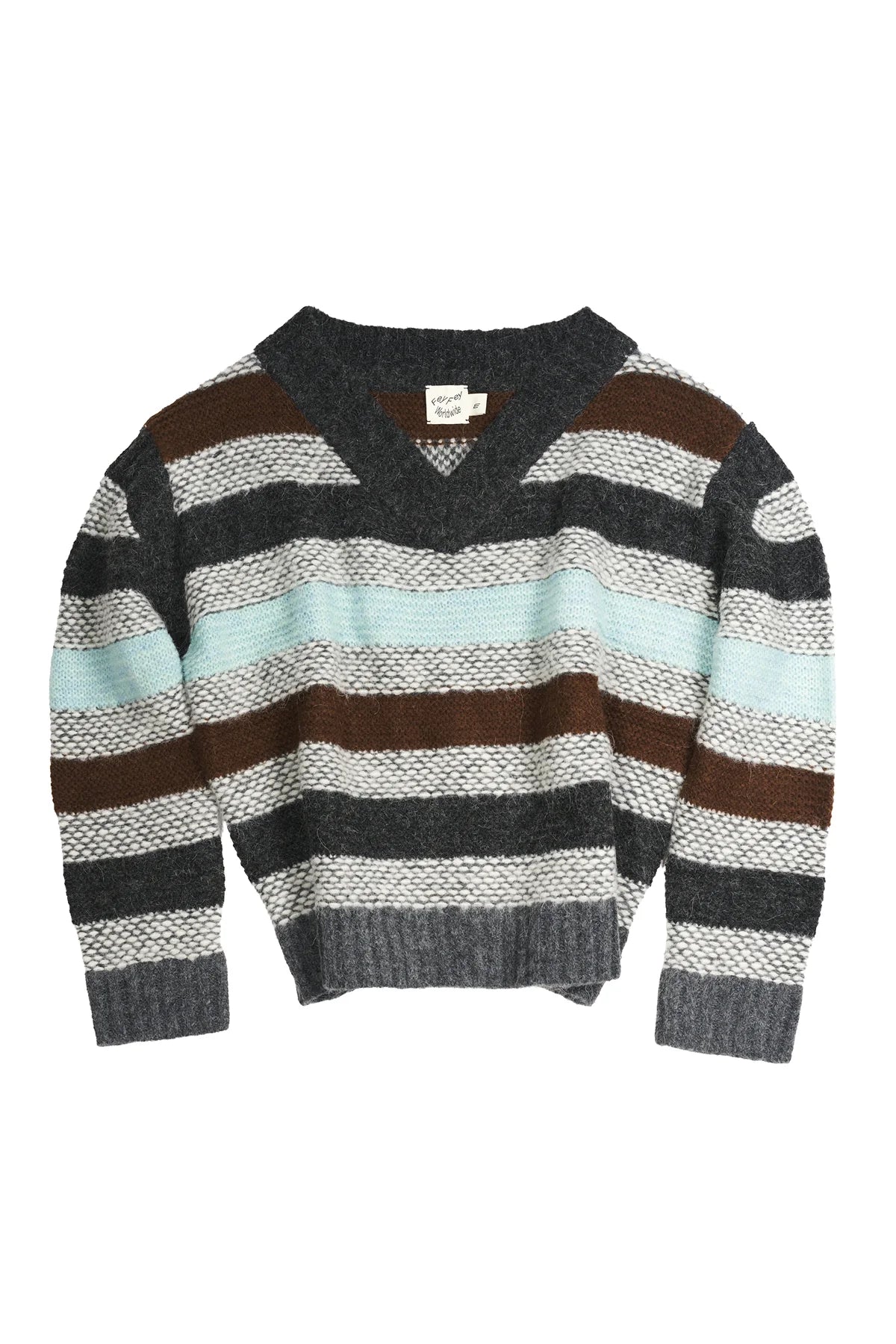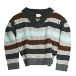 Knit baby alpaca wool sweater with garter stripes throughout. Rib-knit V-neck, shoulders, hem, and cuffs. Dropped shoulders.