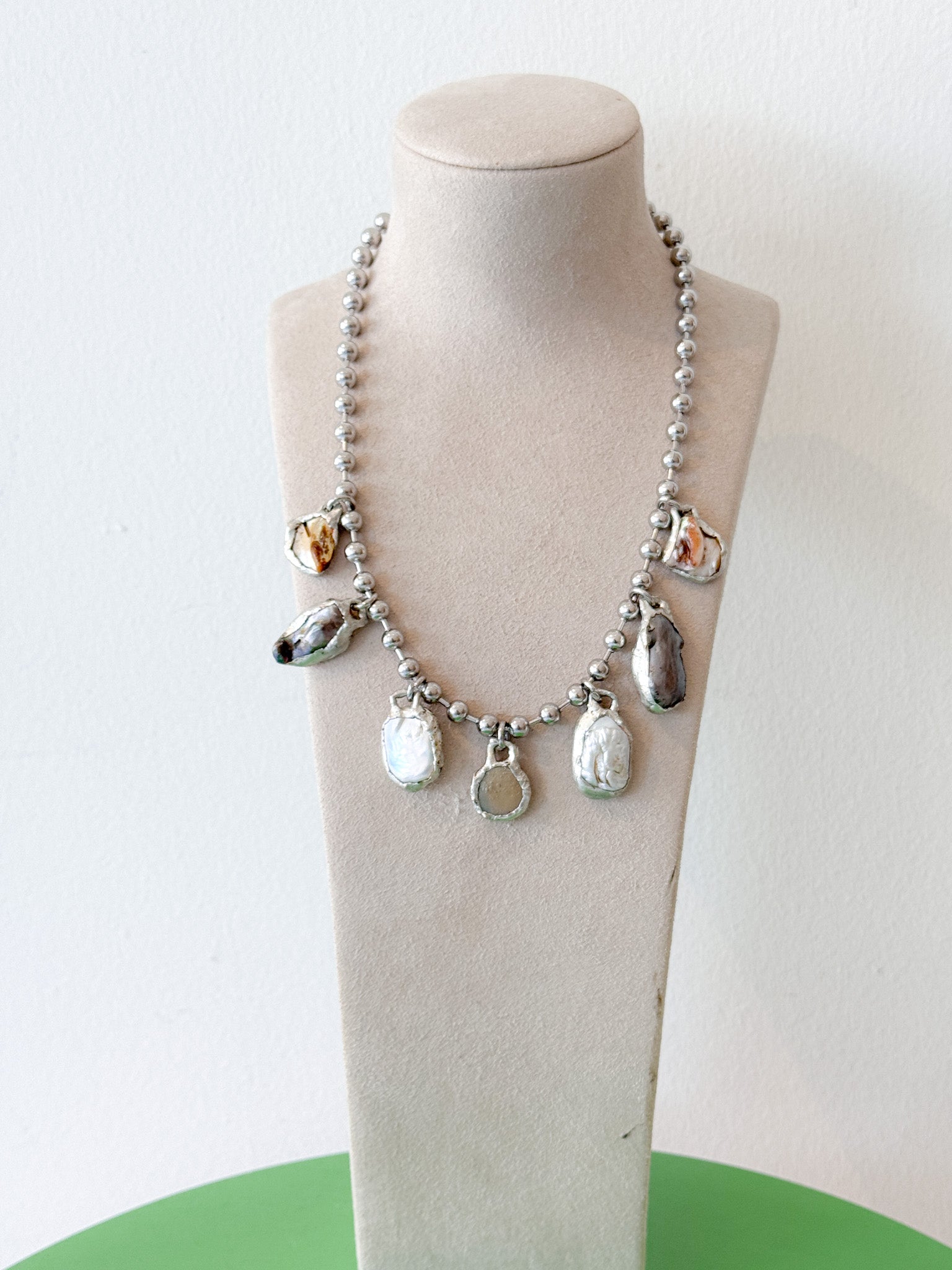 17.5” Soft soldered, 6mm steel ball chain necklace. Pearl and shell pendants are 1/2-1" each.