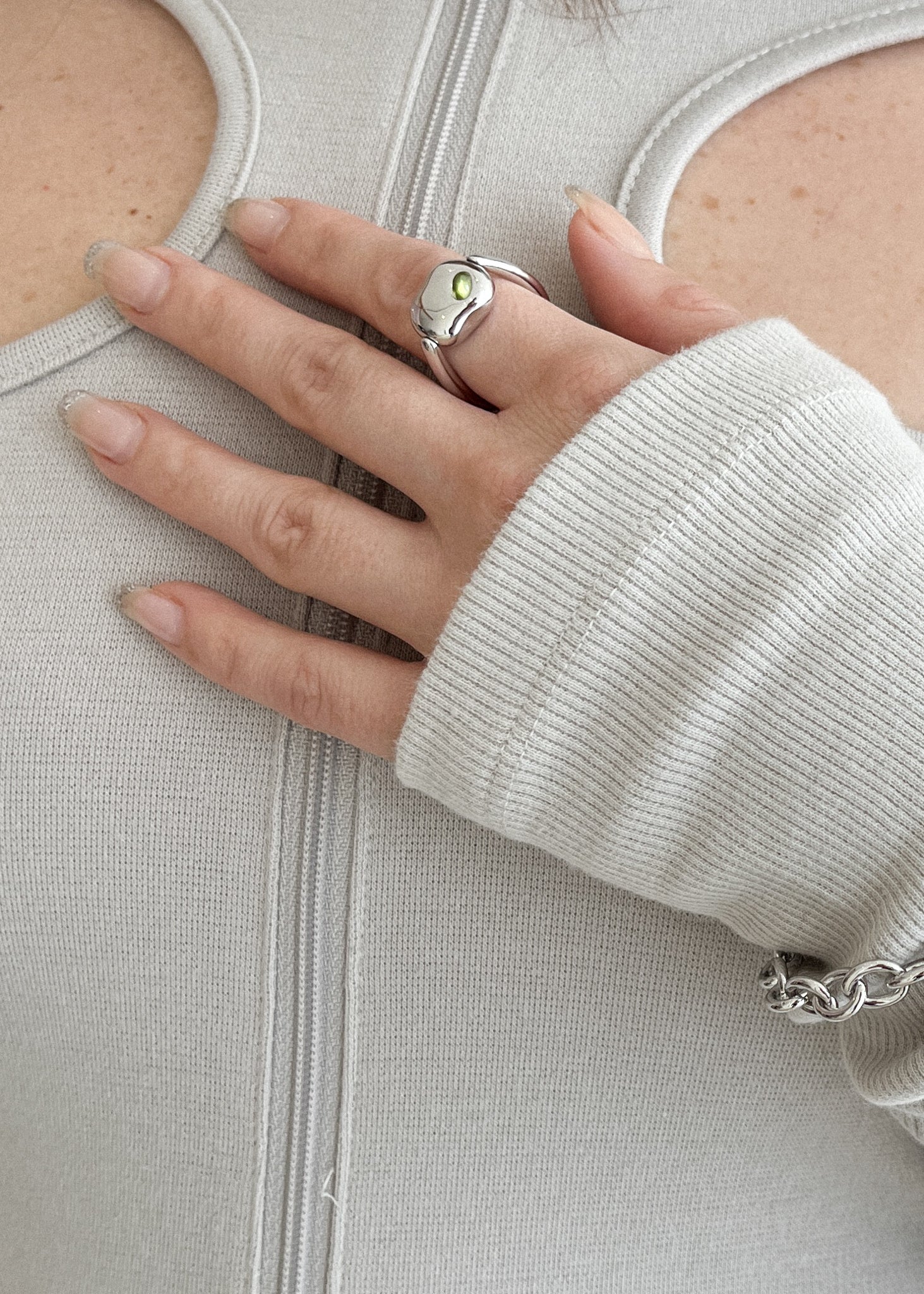 The FF Swivel ring features a swivel mechanism that allows you to wear two rings in one! Flip between a clean-faced side or one set with a conflict-free oval Green Peridot stone. You can wear up or down one full size. 100% recycled 925 sterling silver.
