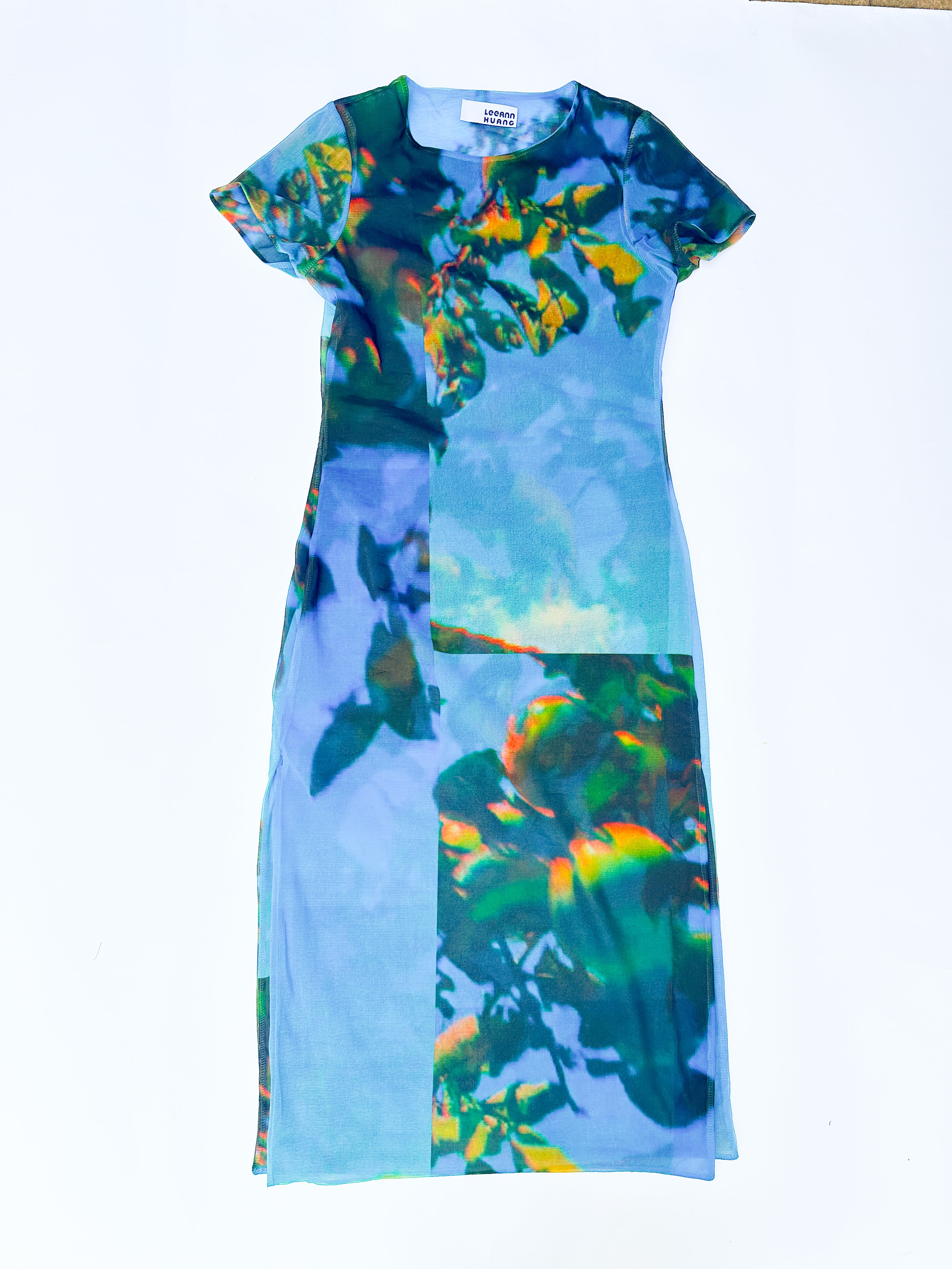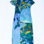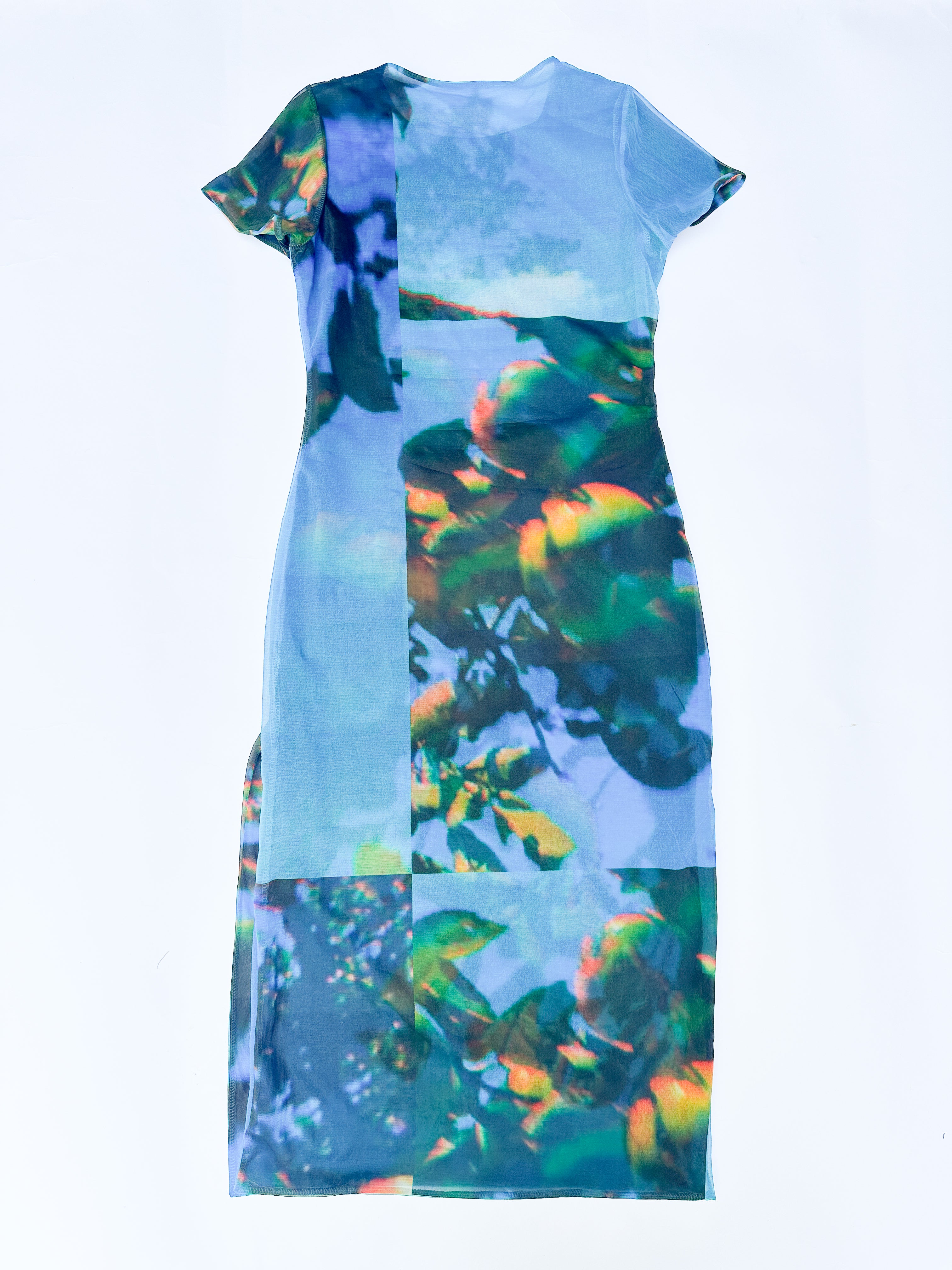 Loop mesh printed short sleeve midi dress with side slits, pullover style.