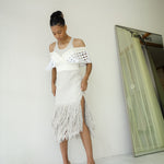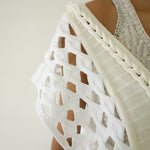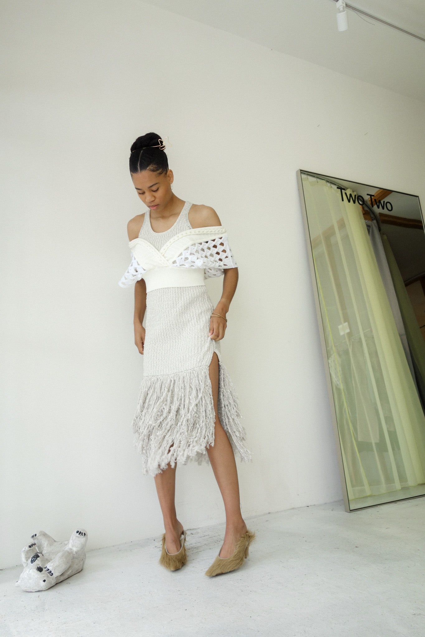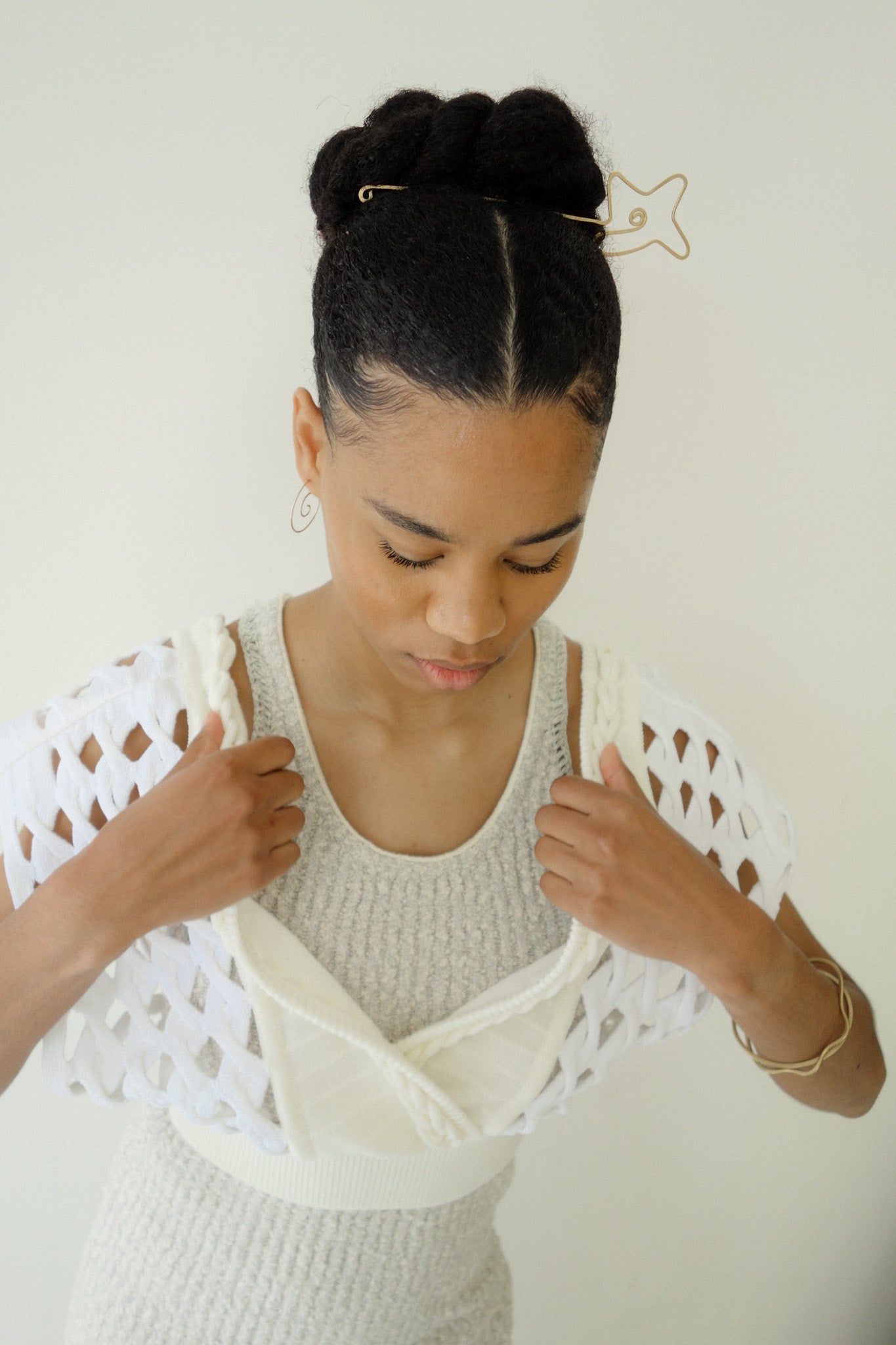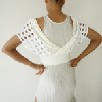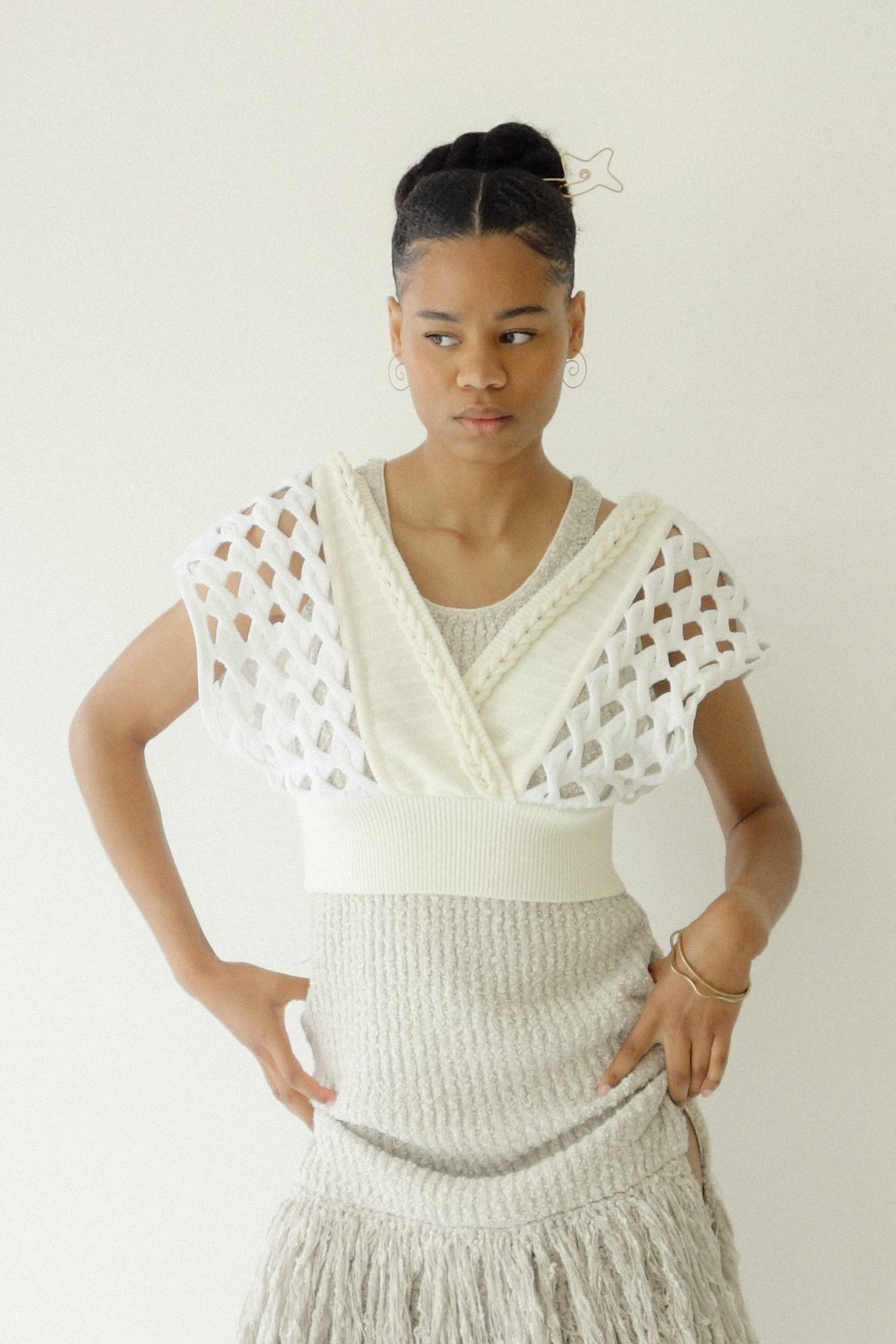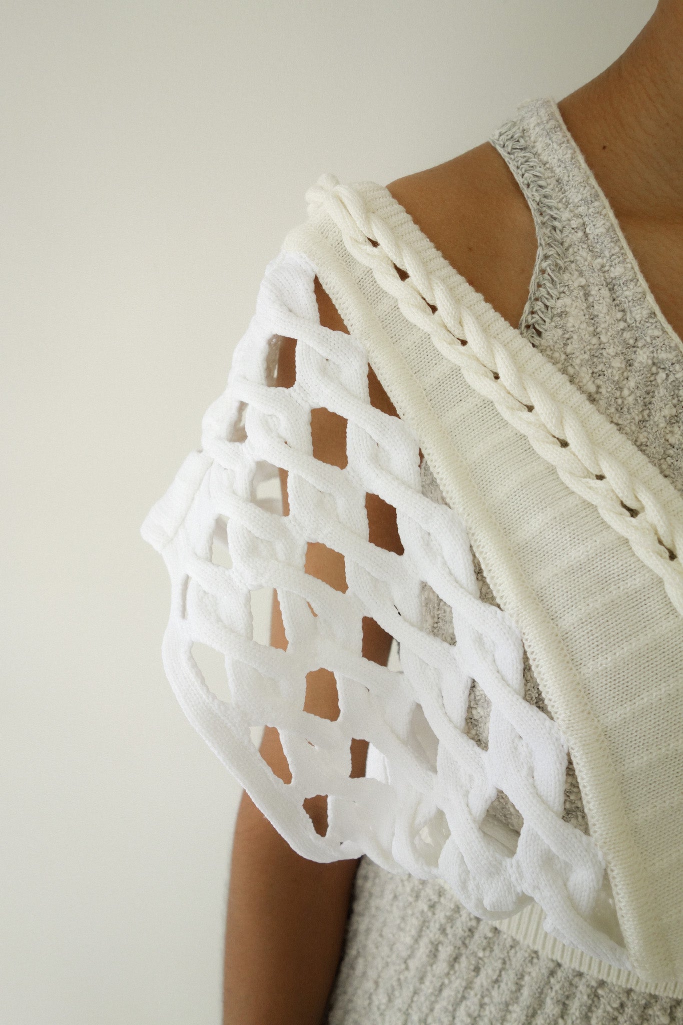The design of this vest and the holes between them are formed in a way that only a few domestic knitting machines can achieve. Chunky yarn tends to give a heavy impression, but the mixed open knit makes it breathable and flowy with lots of room for creative layering. The cables in the center of the garment are pulled up by hand to create a three-dimensional accent.