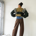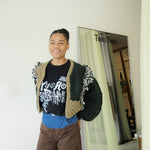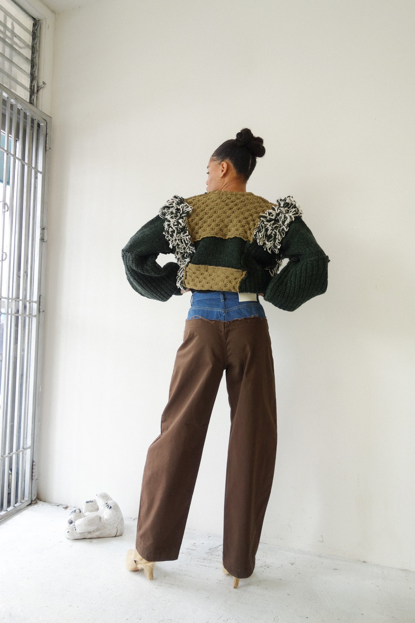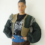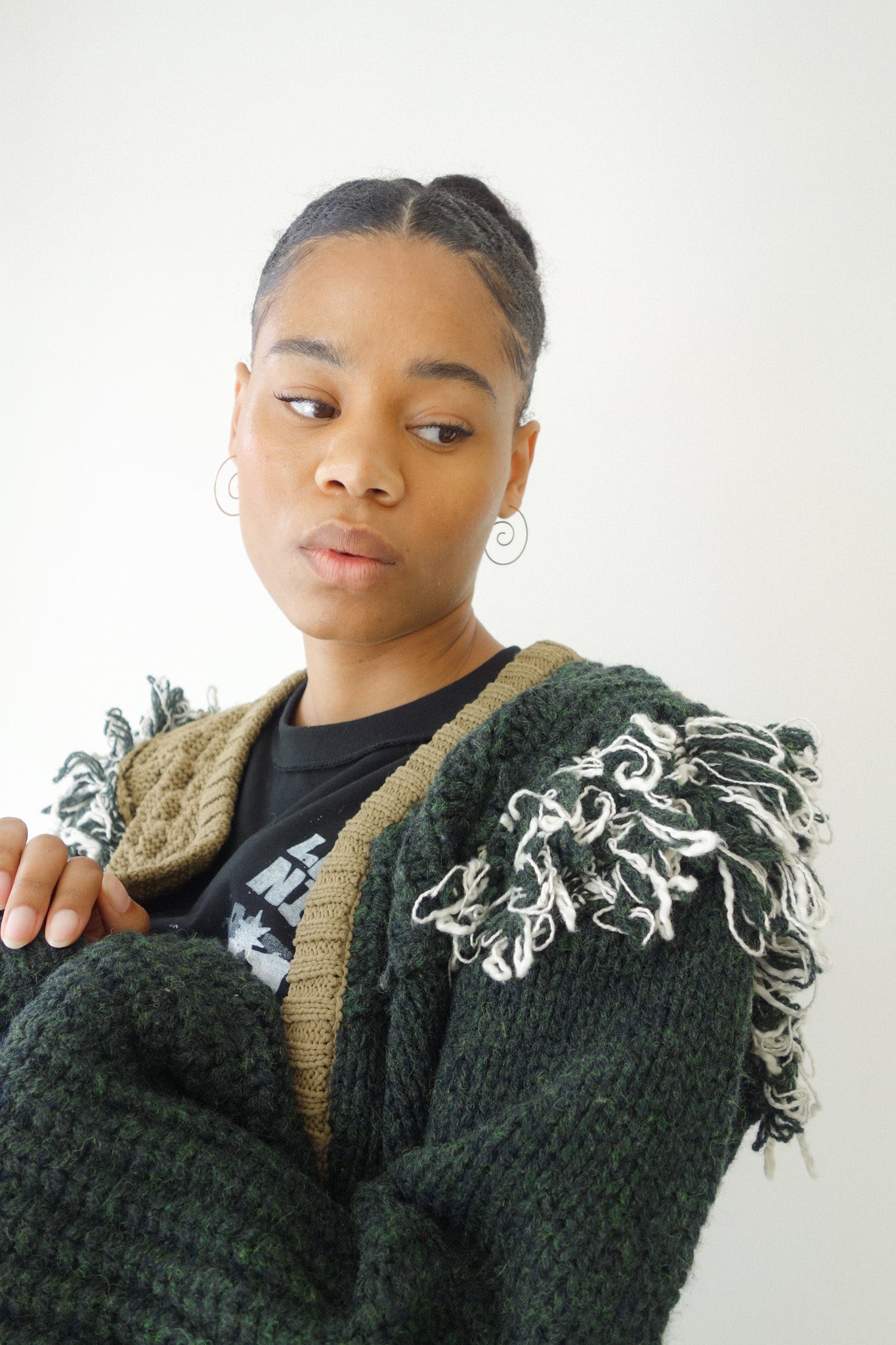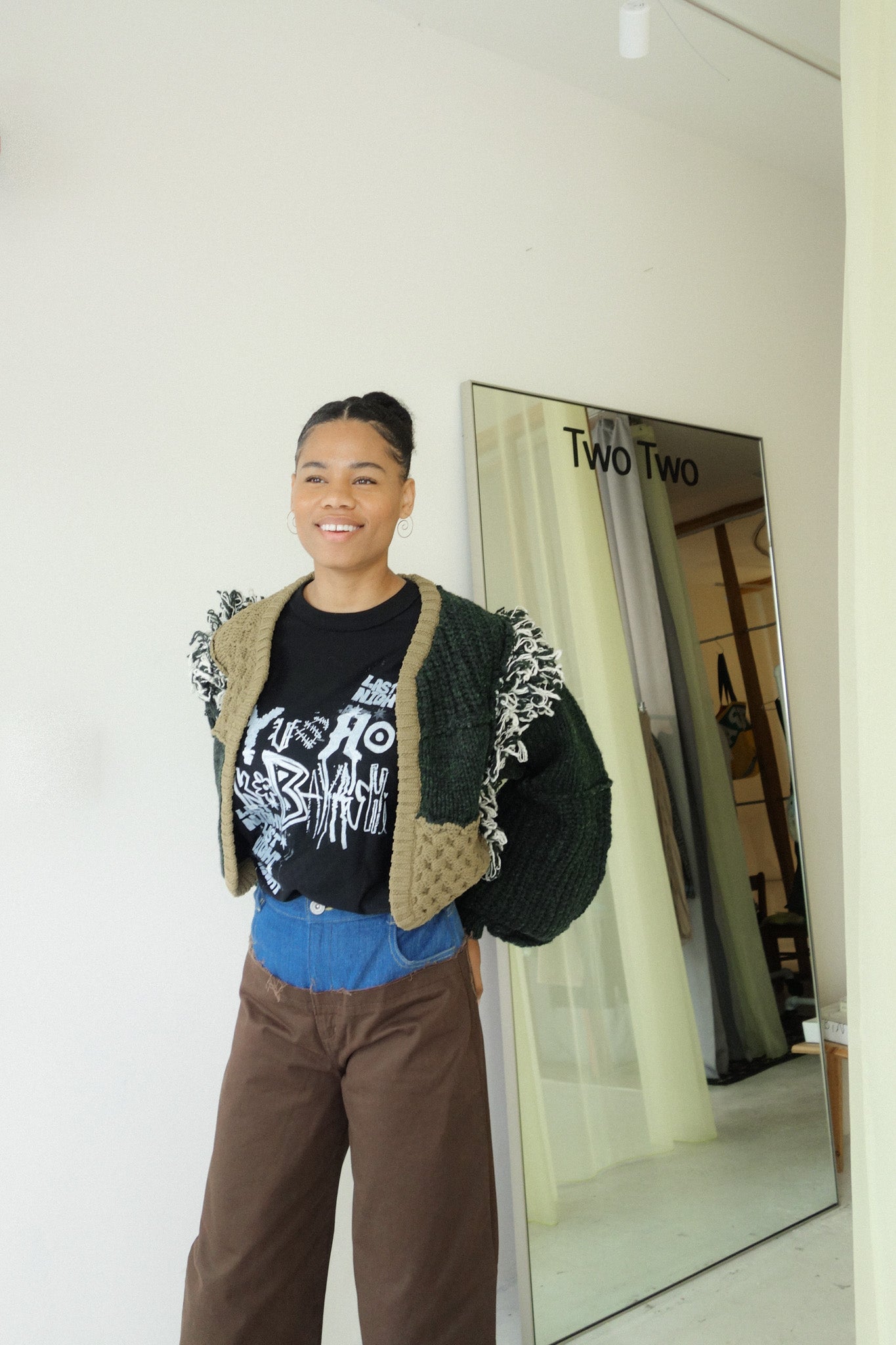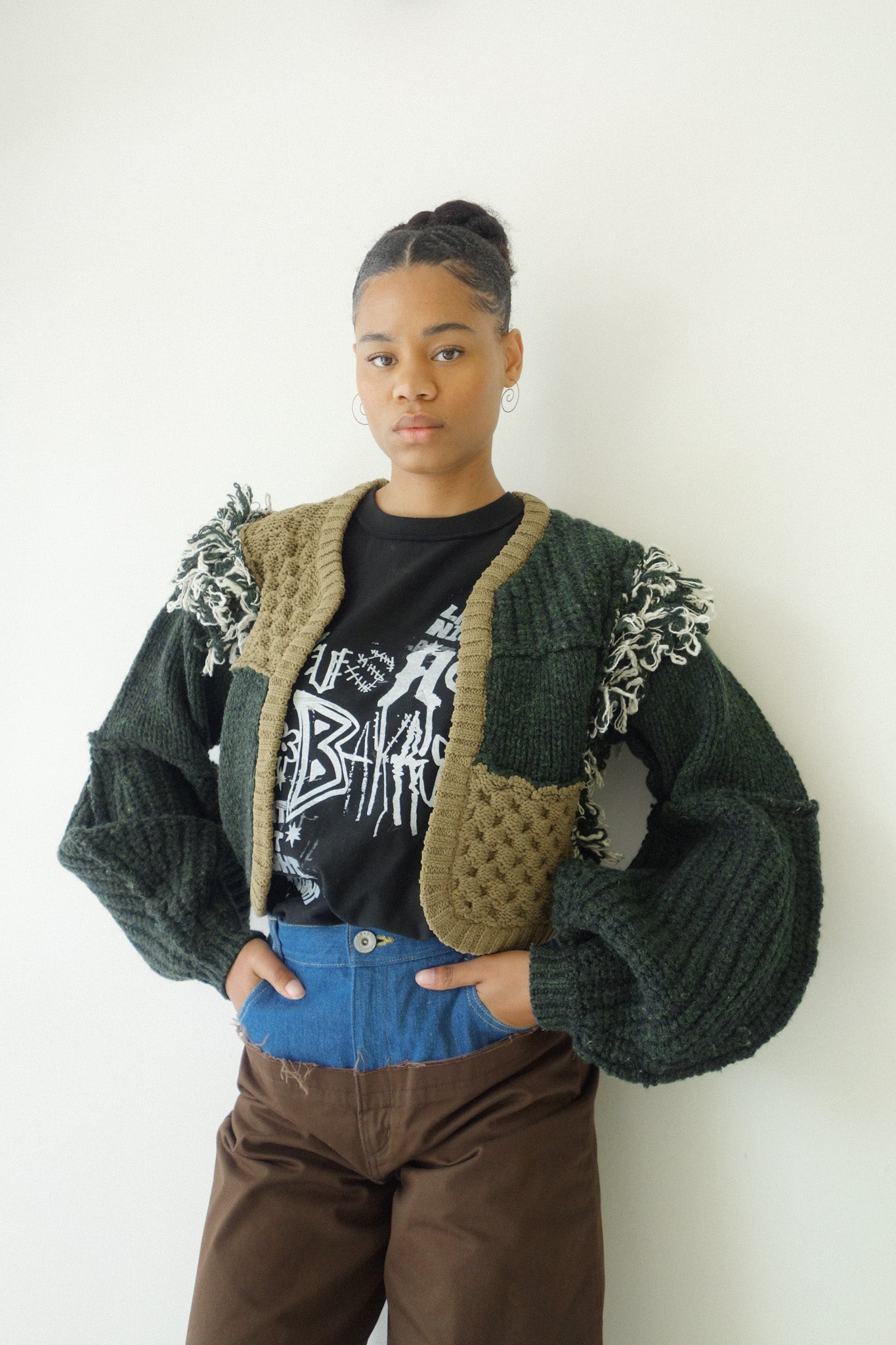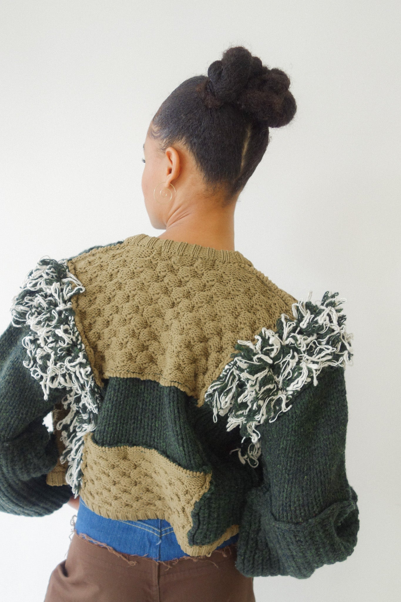 Patchwork wool cardigan in natural shades of dark green and brown, formed with various knit stitch patterns. With bouclé fringe thats hand knitted for a full, dimensional look.