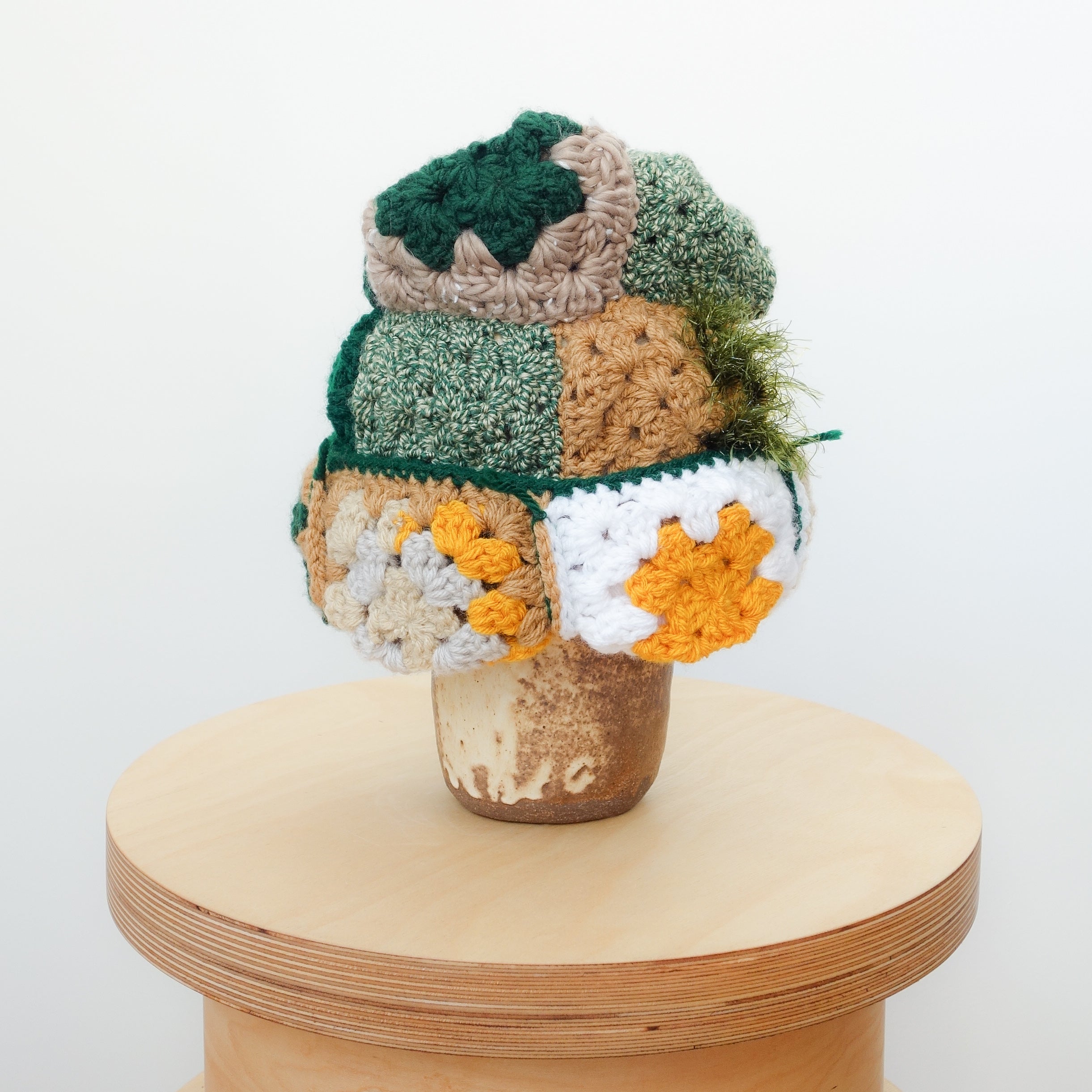 ID: Hand crocheted, multicolor beanie in mustard yellow / green / white / beige