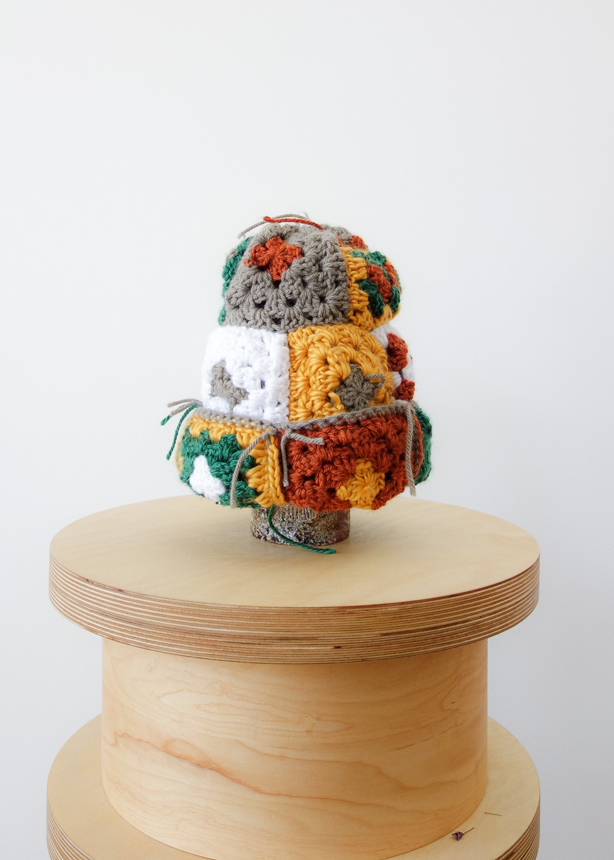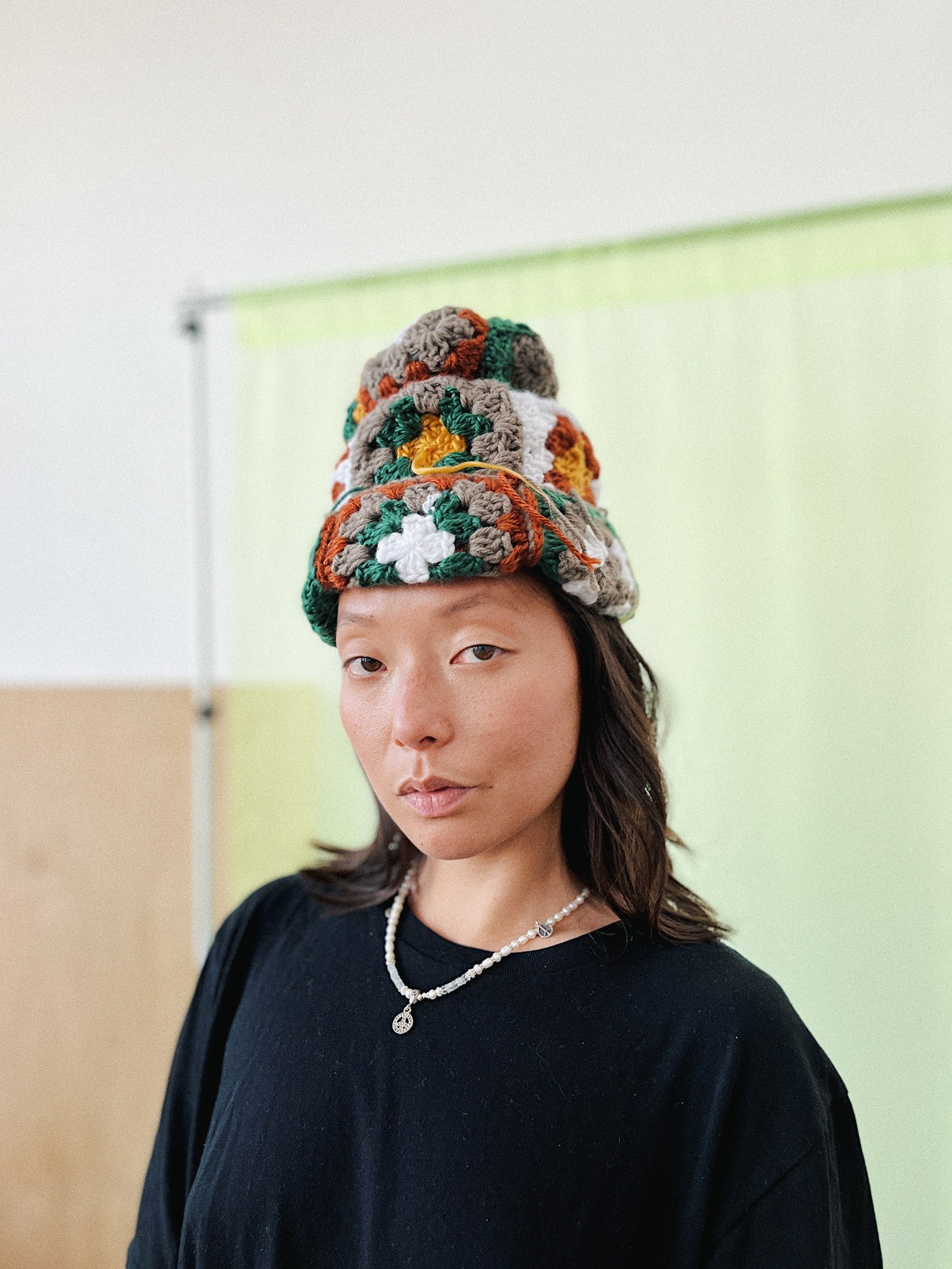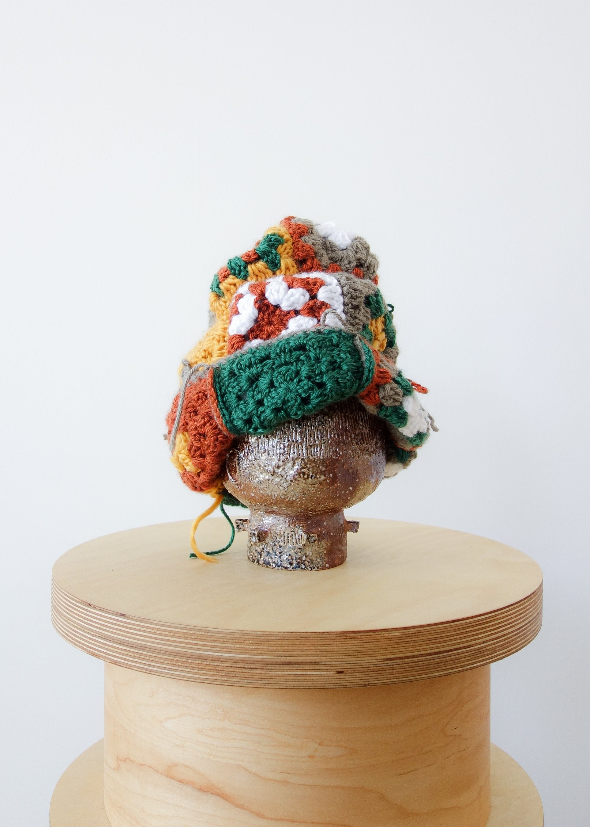 Each square was individually crocheted, patchworked and then hand sewn together to form this article of headwear.