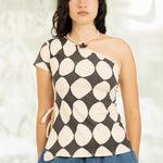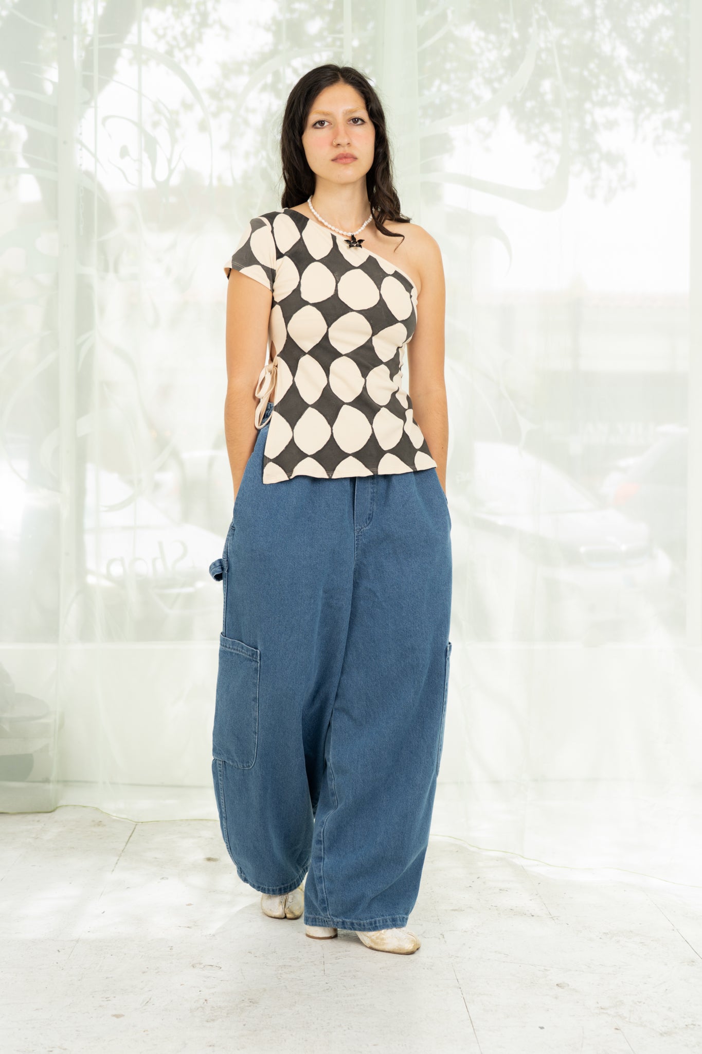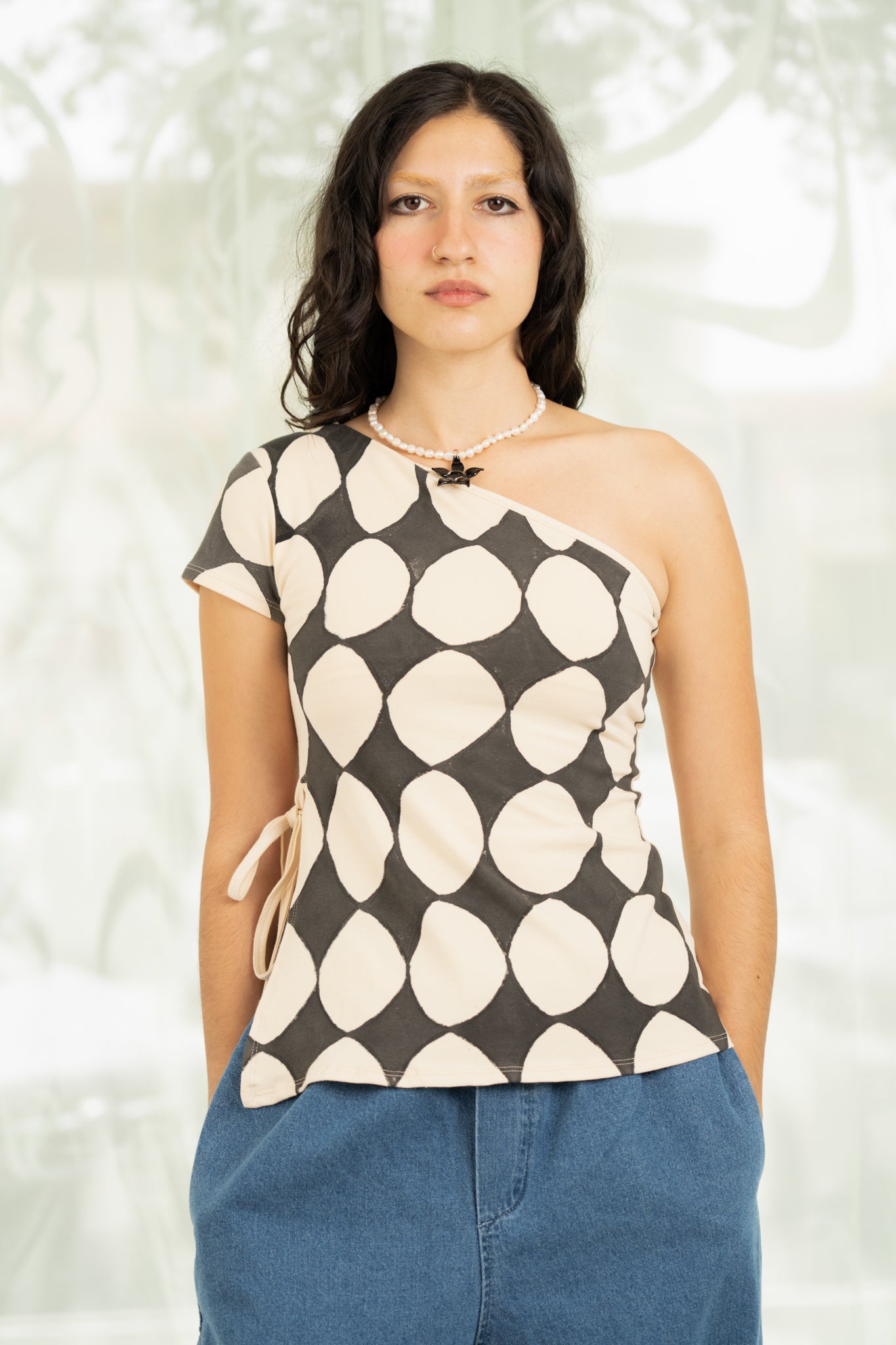 The Balance Top is hand painted and constructed from a stretchy Turkish Cotton. Opens and ties on the side. Made in New York.