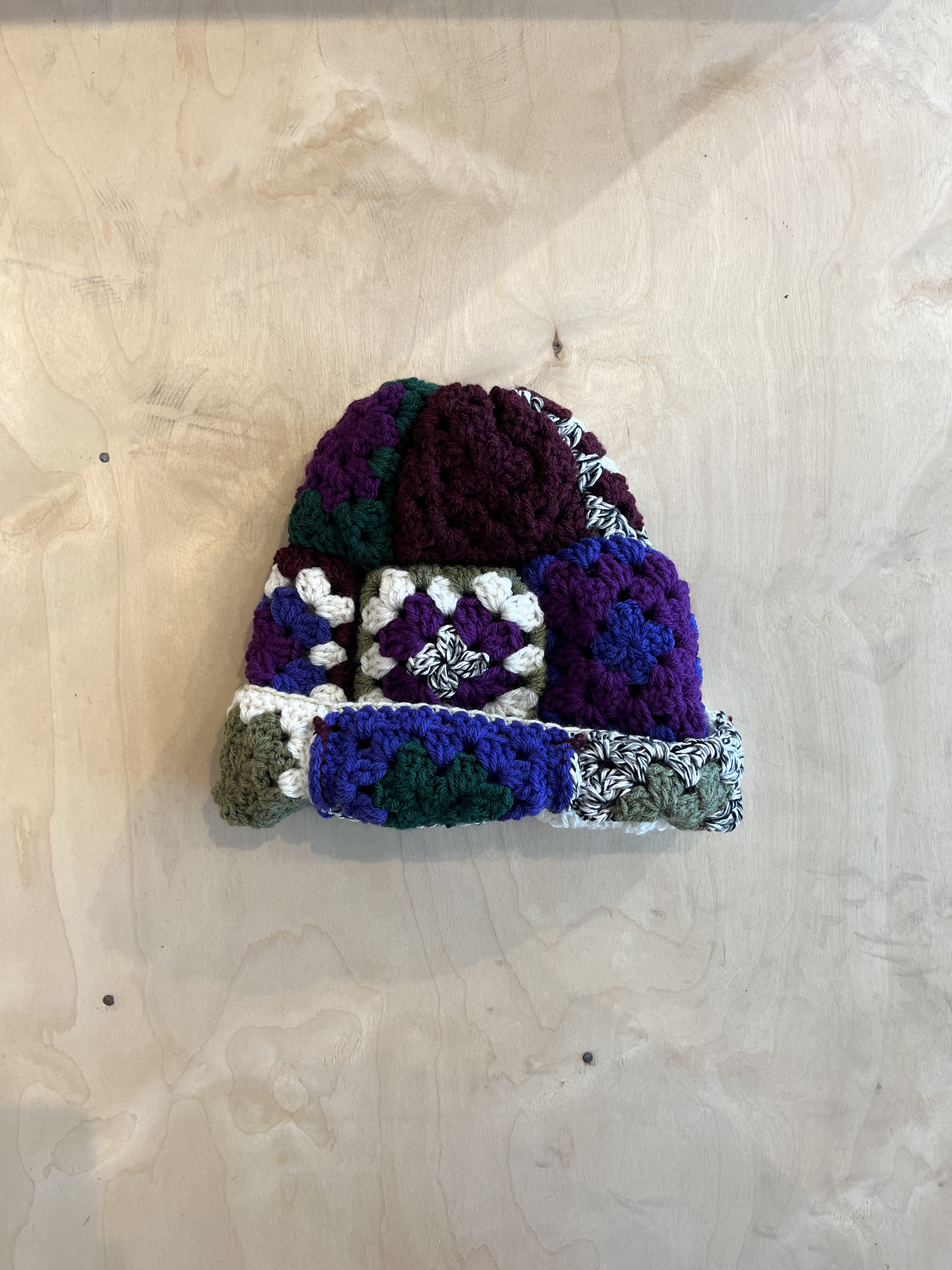 Each square was individually crocheted, patchworked and then hand sewn together to form this article of headwear.