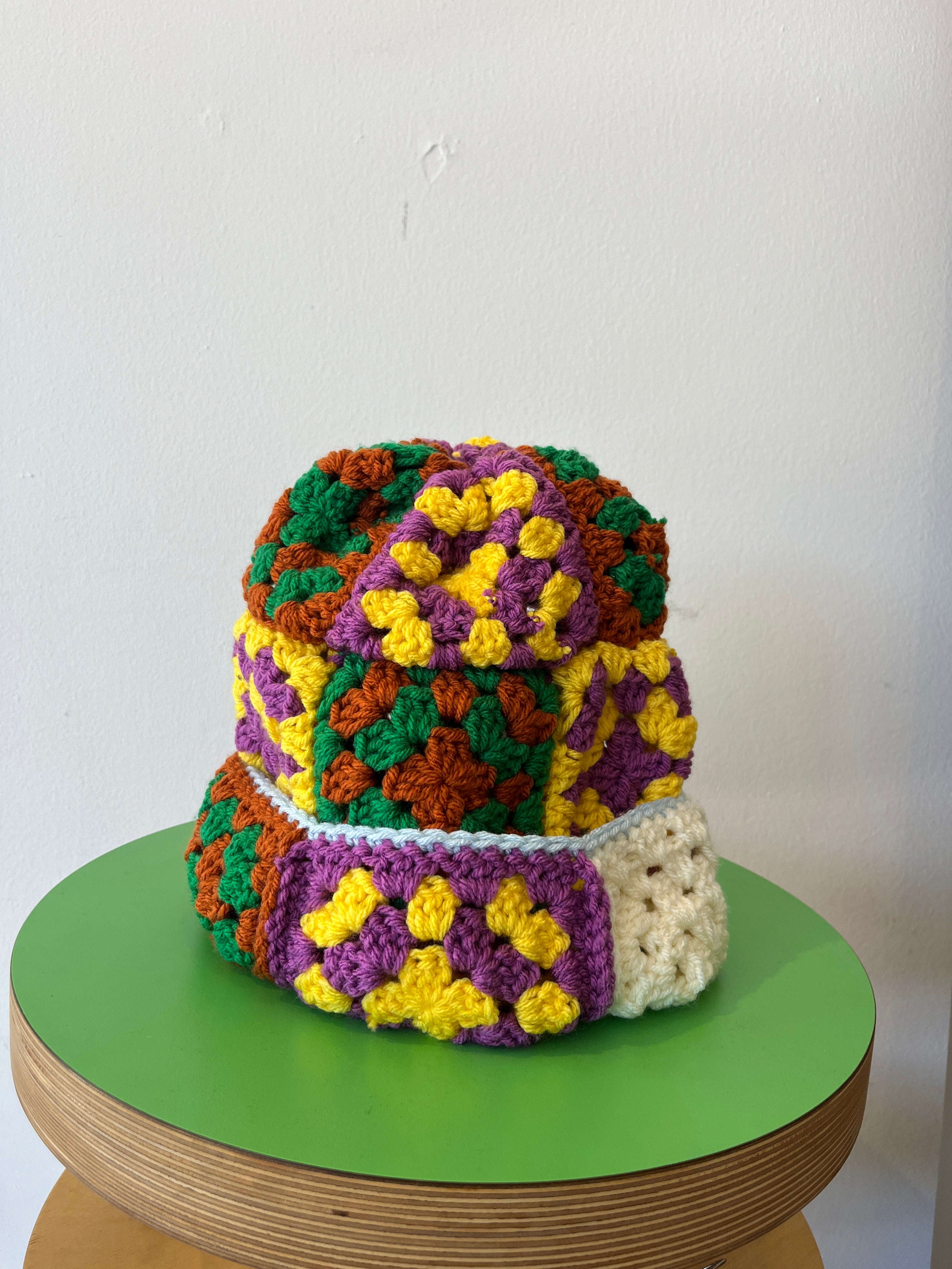 Each square was individually crocheted, patchworked and then hand sewn together to form this article of headwear.