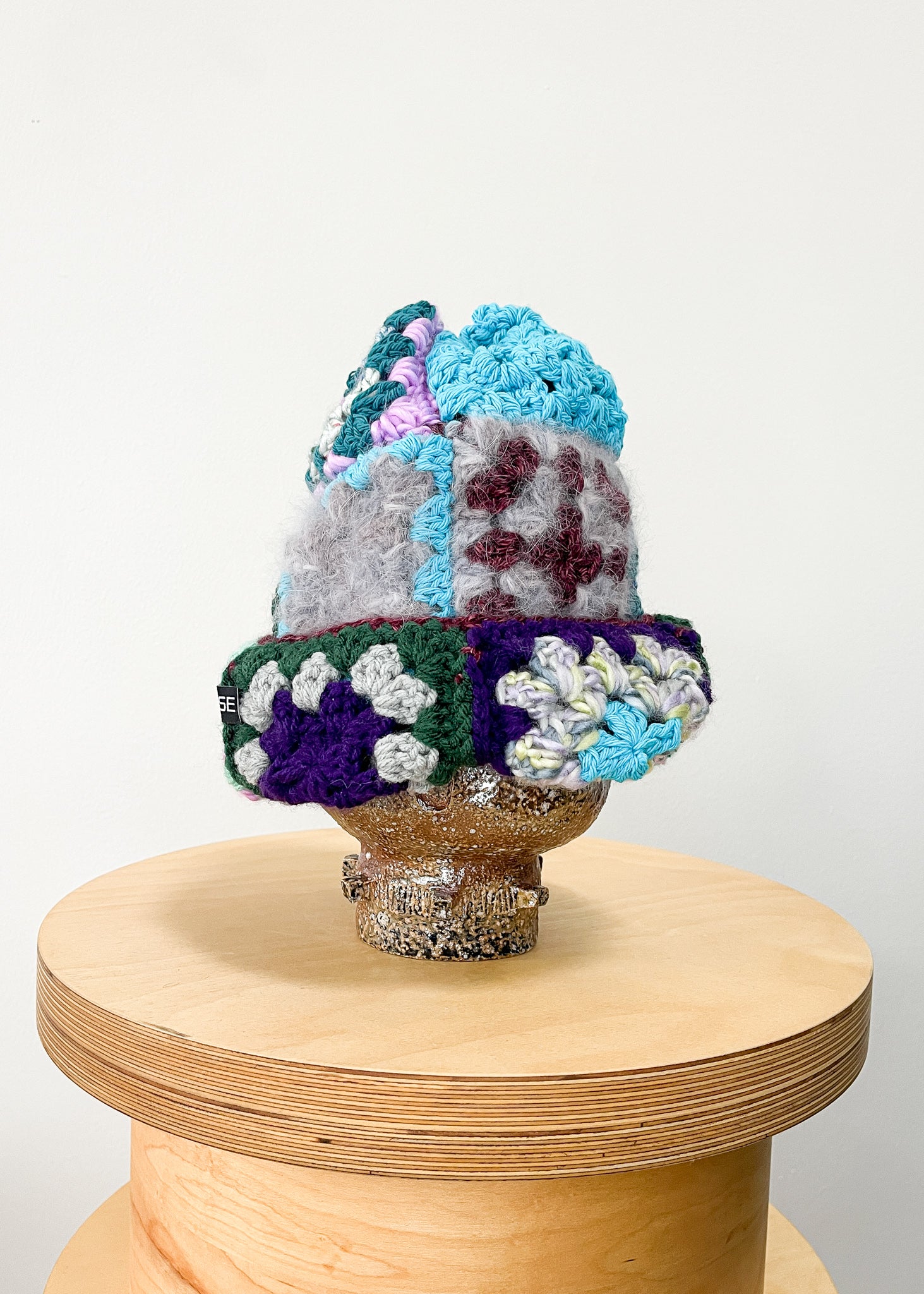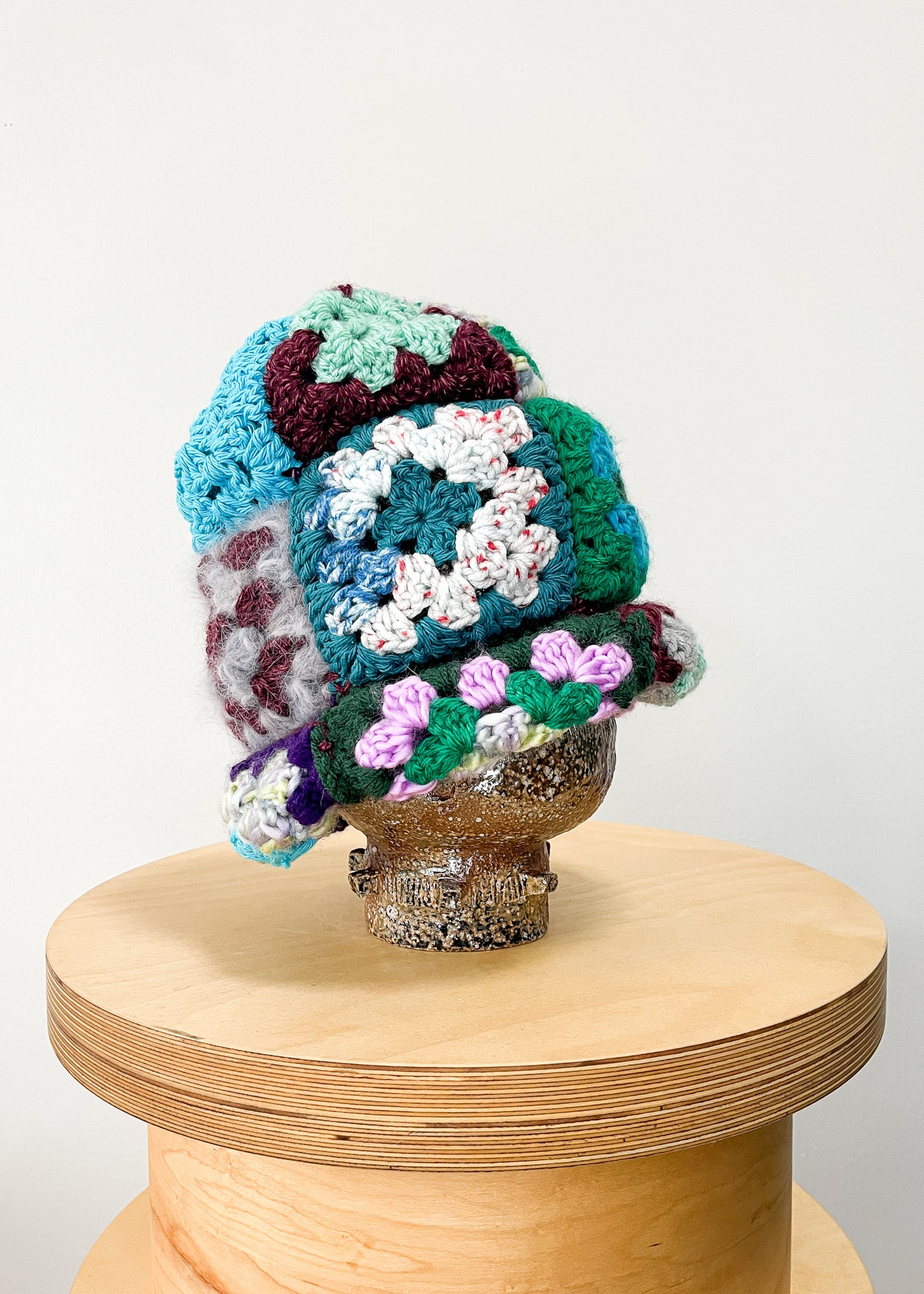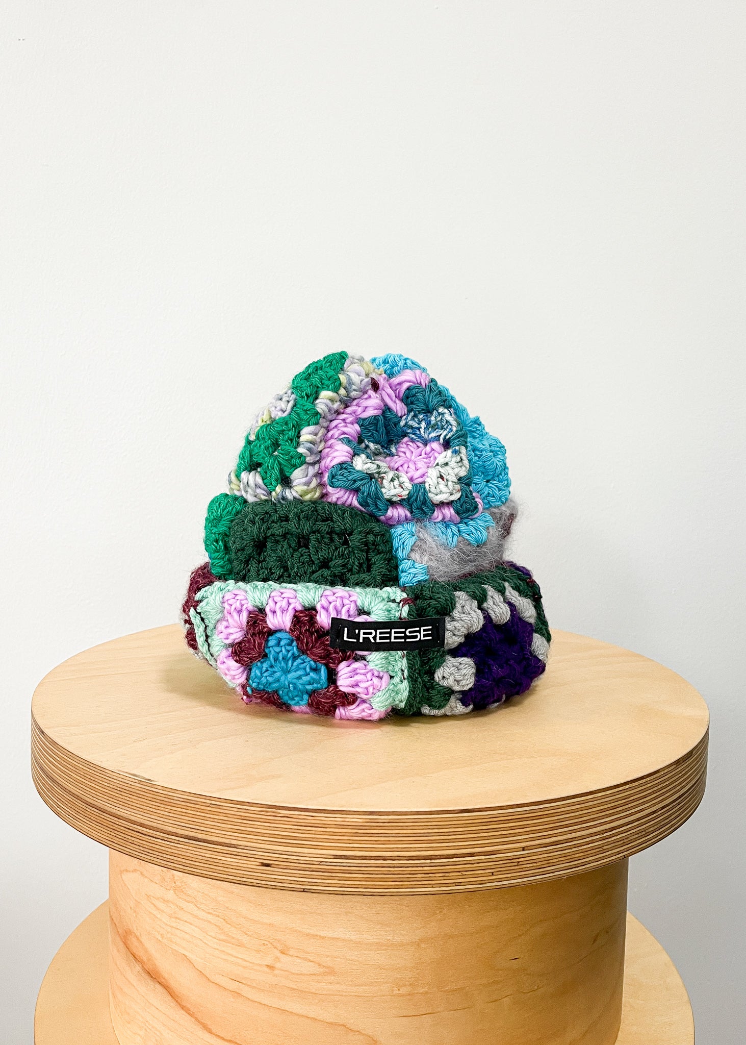 Each square was individually crocheted, patchworked and then hand sewn together to form this article of headwear.