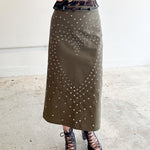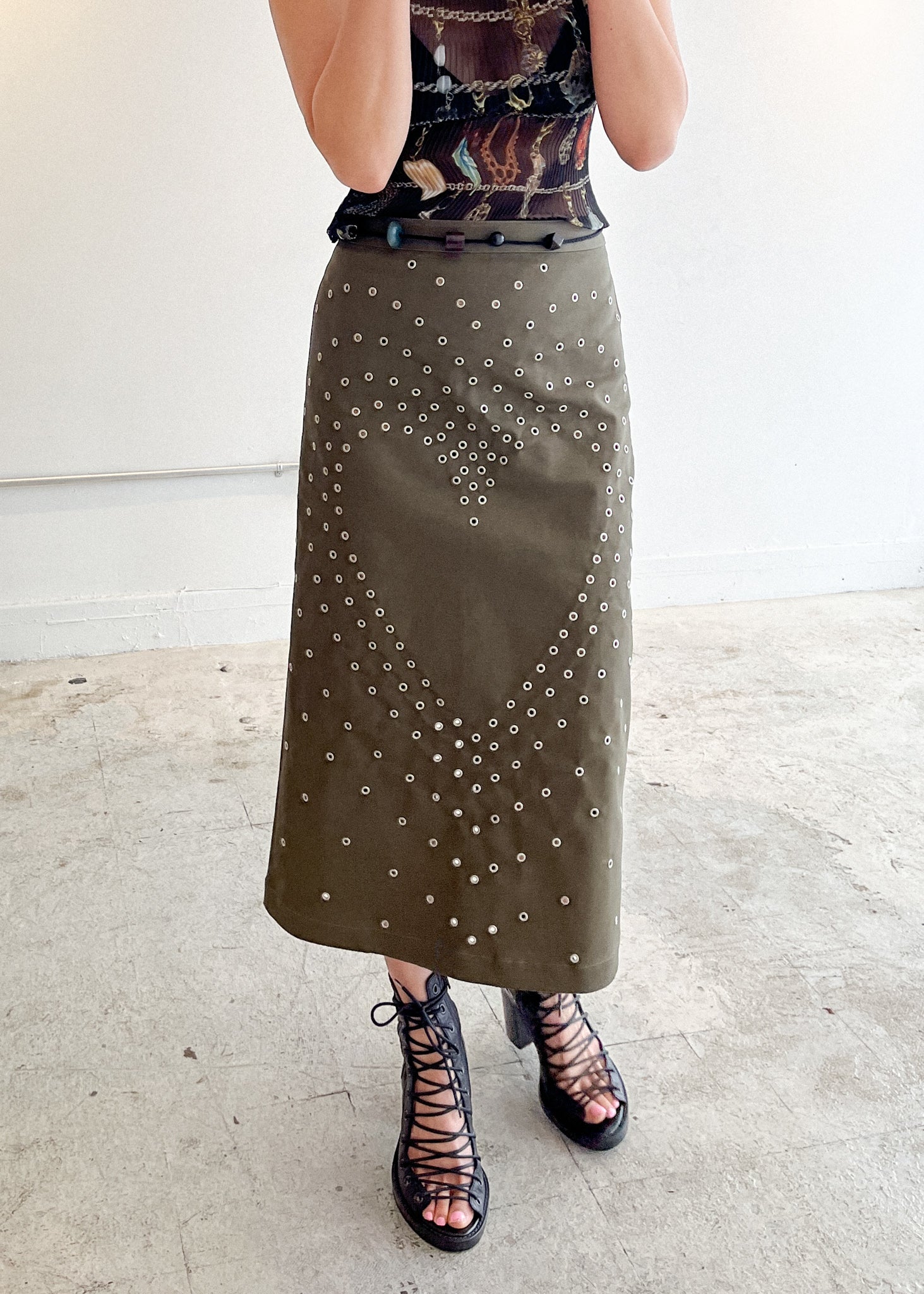Olive green midi length skirt with eyelets on the front, and a center slit in the back.