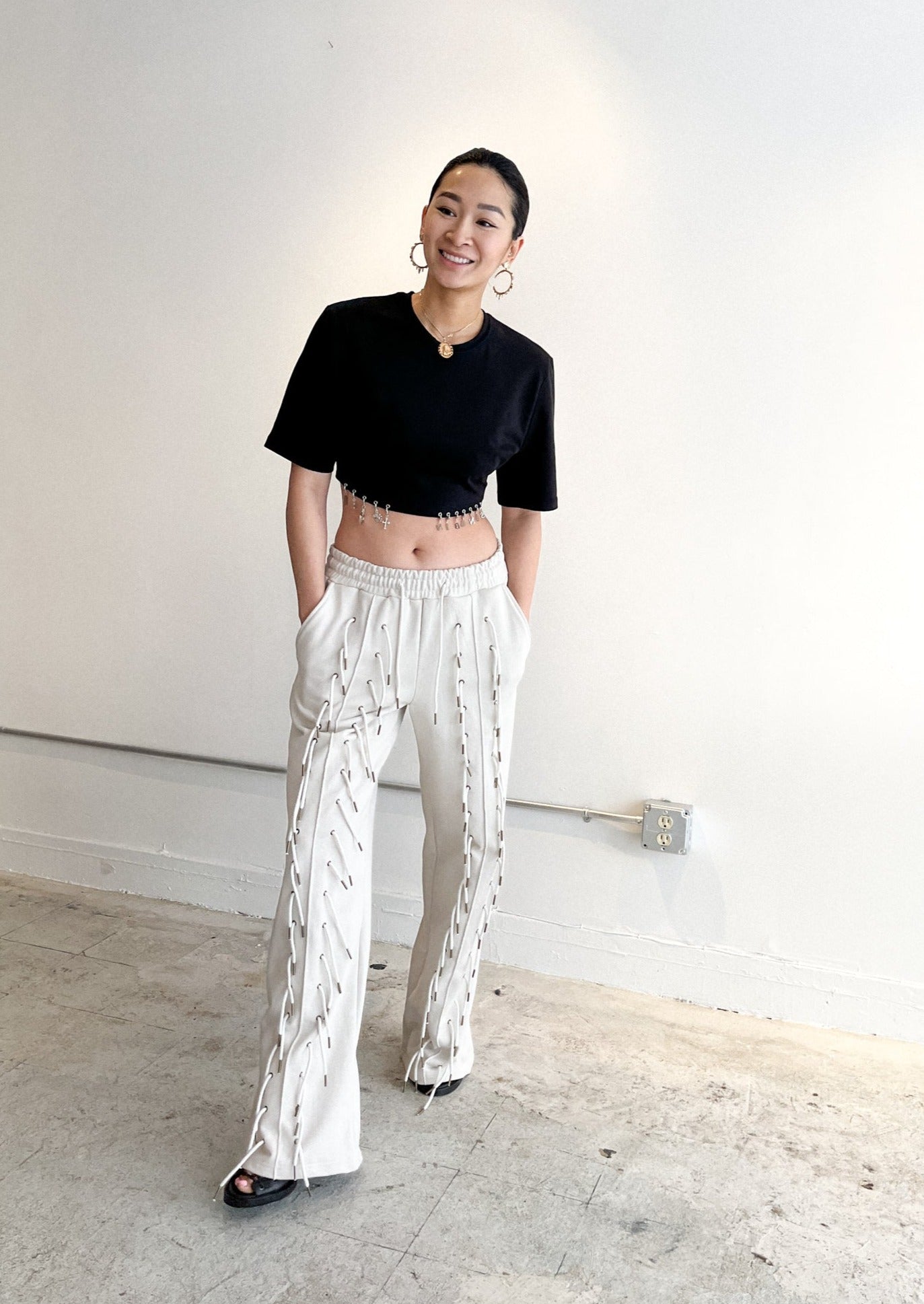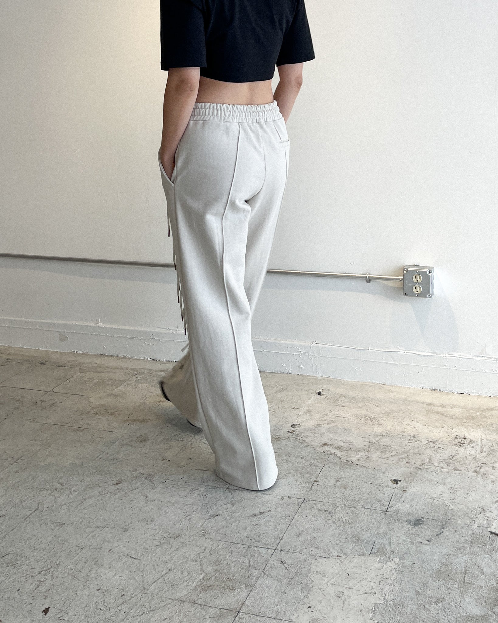 Cotton sweatpants with detachable strings, side seam pockets, and elastic waistband.