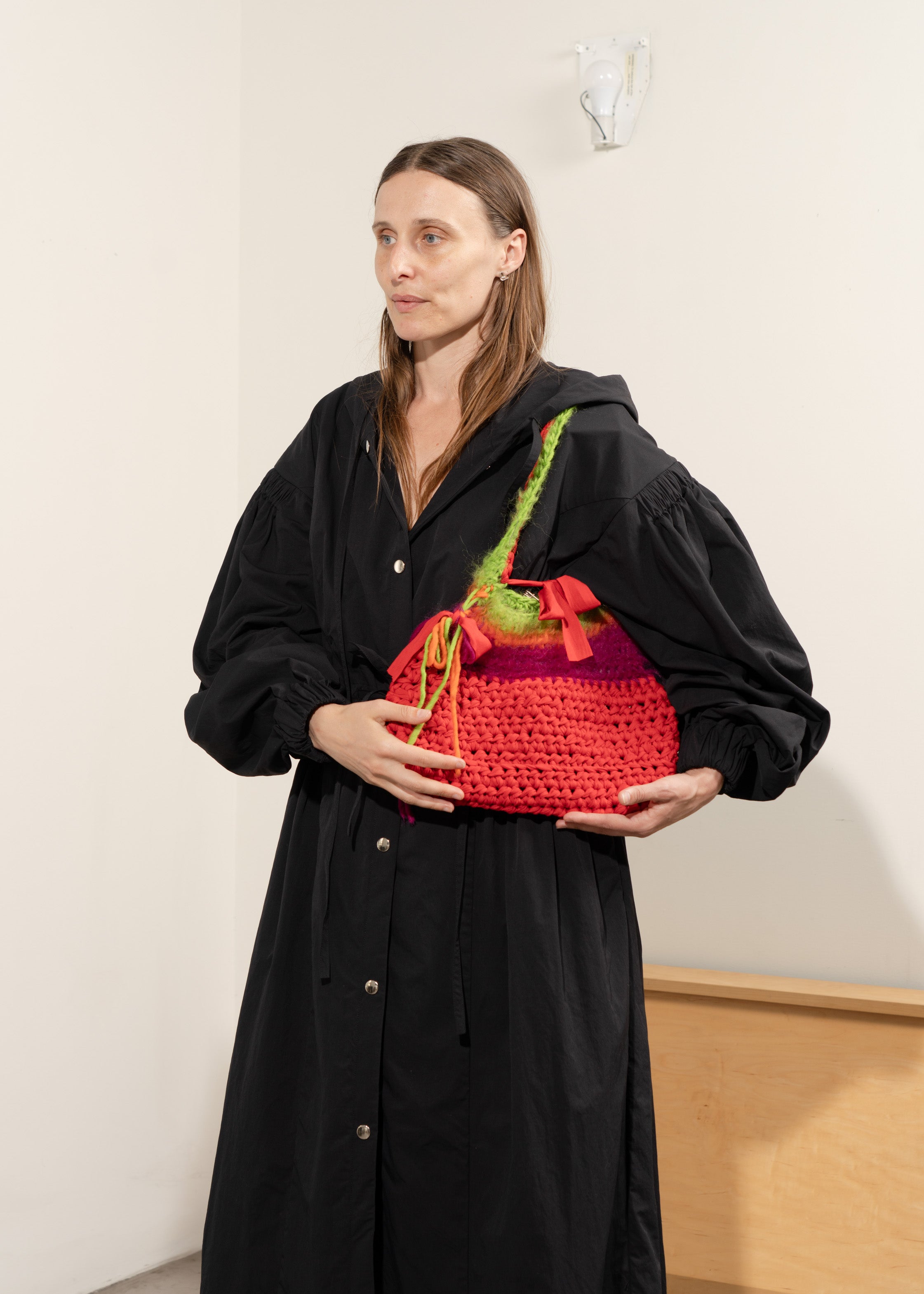 Knit purse with red body and green straps made with cotton, wool, mohair