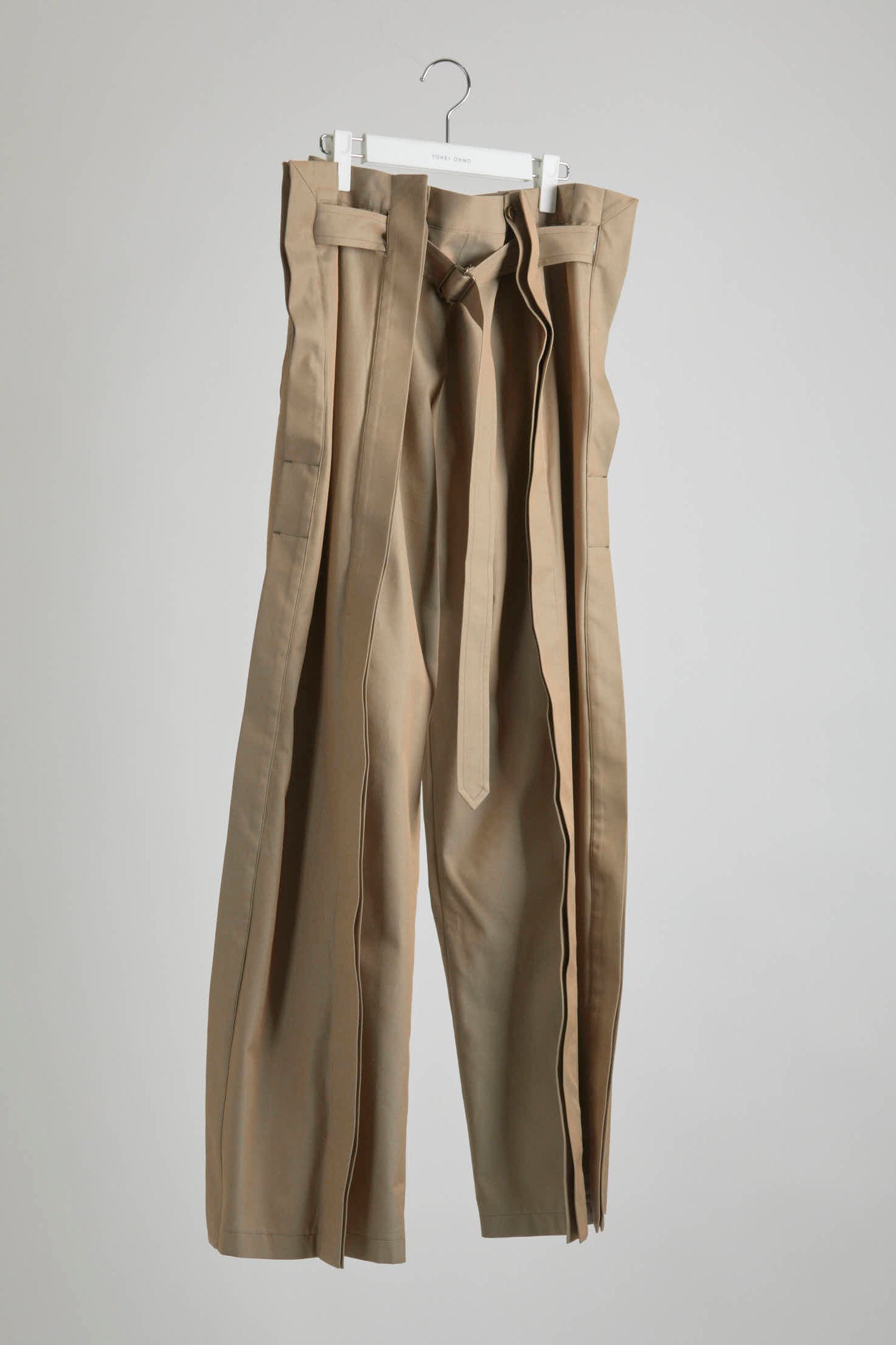 YOHEI OHNO's archived “picture frame” pants were reprinted after a long request from the staff. They did not just reissue them, but made some minor changes to fit the current mood. Depending on the tightness of the waist belt, the pants can be worn high-waisted or low-waisted, and can be worn in a variety of ways. The material is