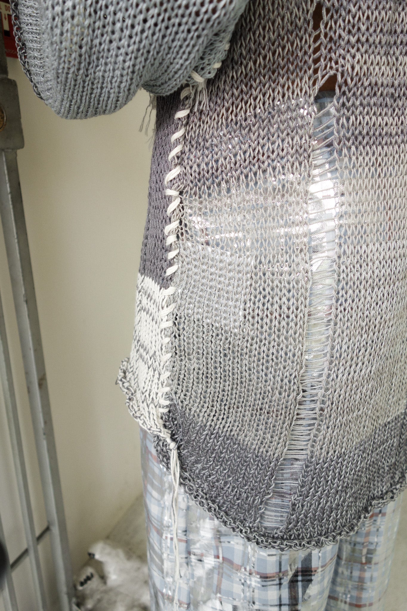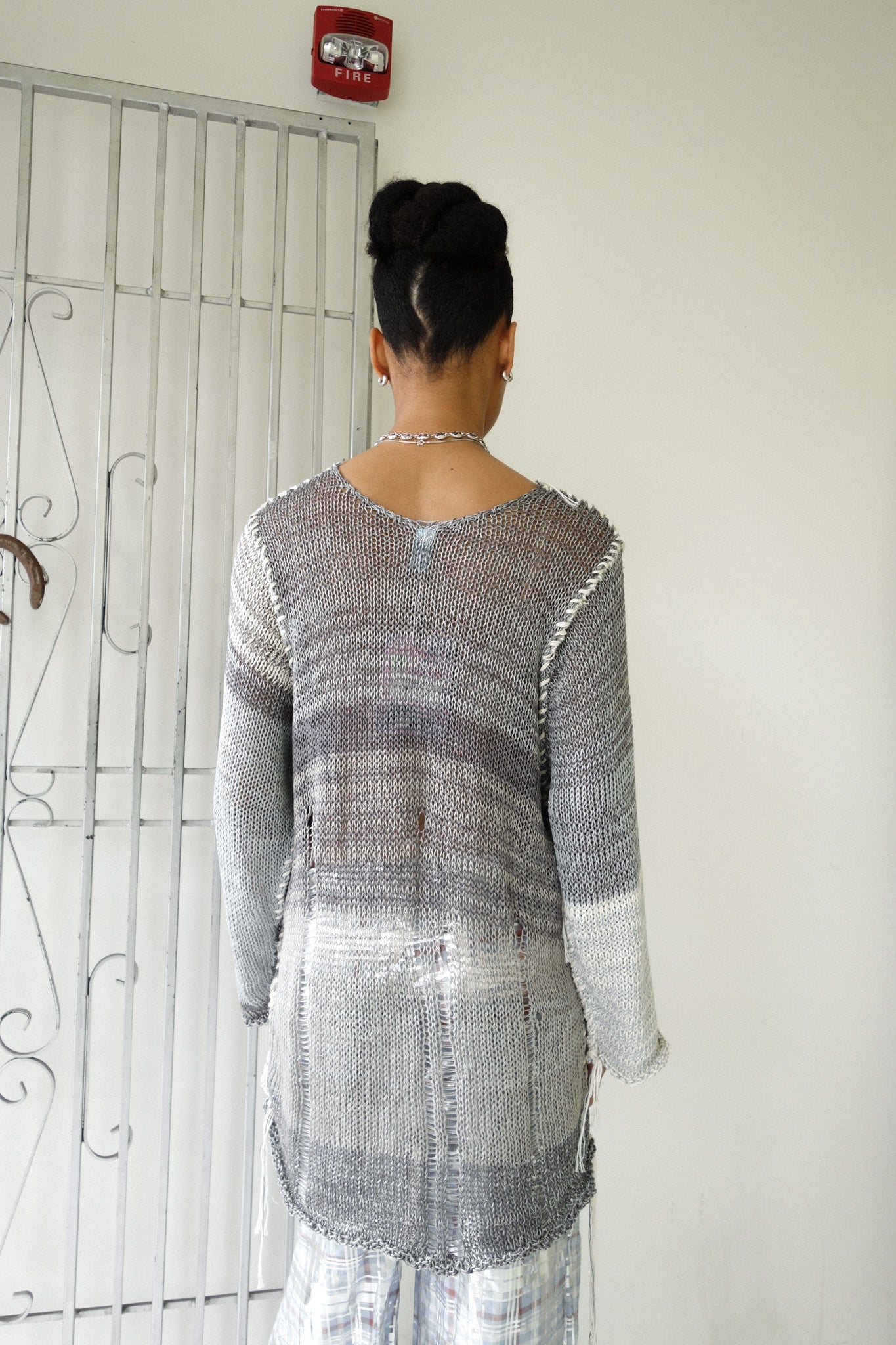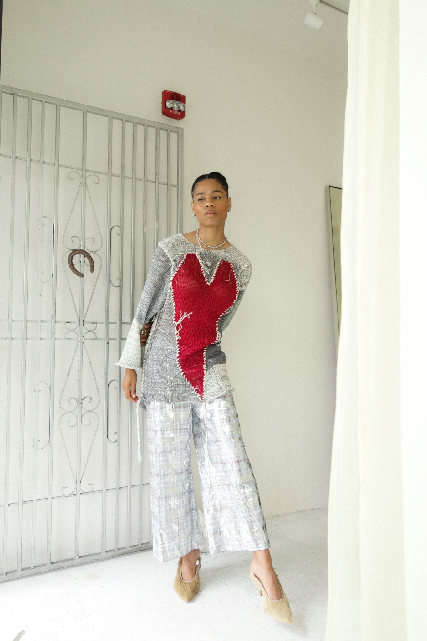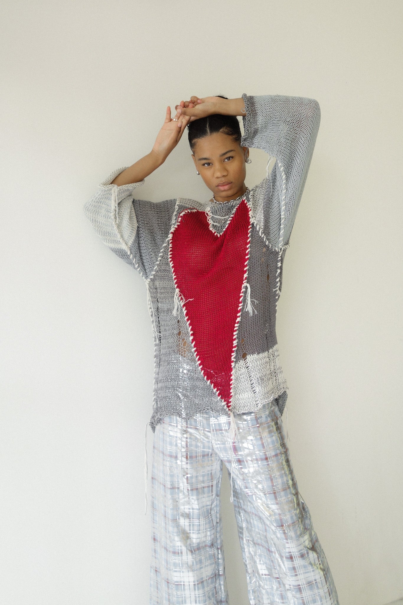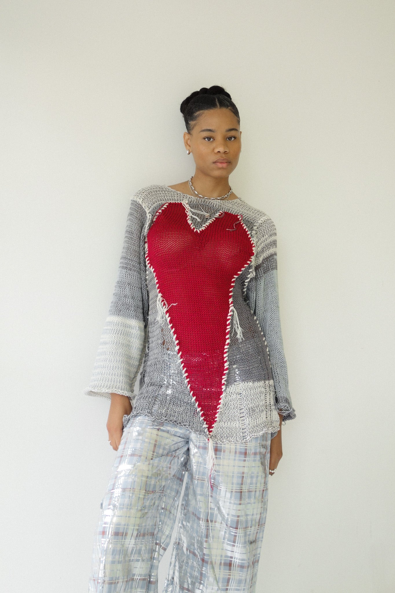1/1 knit long sleeve top is an exclusive color for Two Two, in gray and white with red heart. Free size