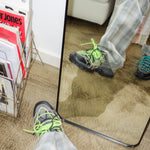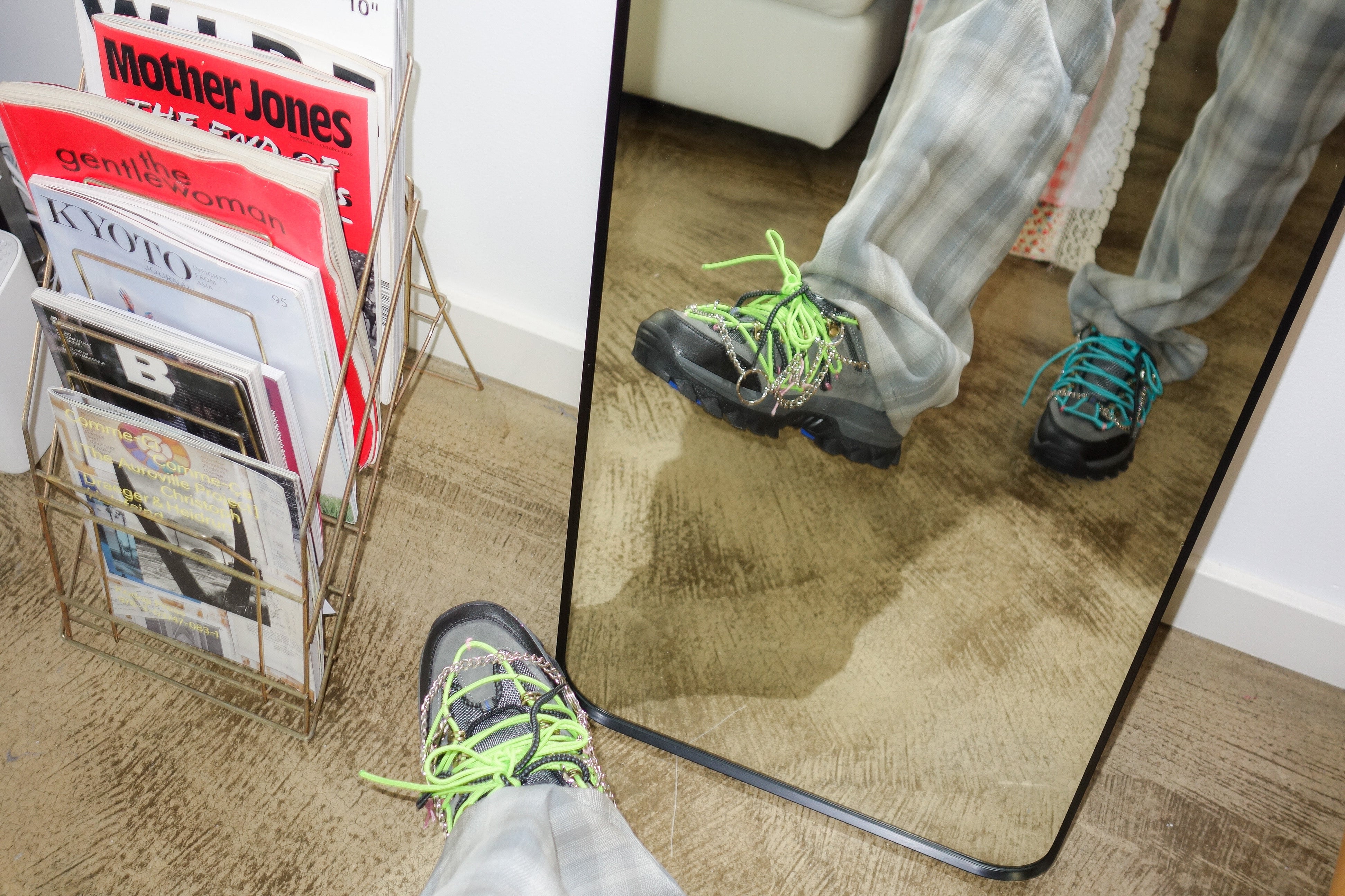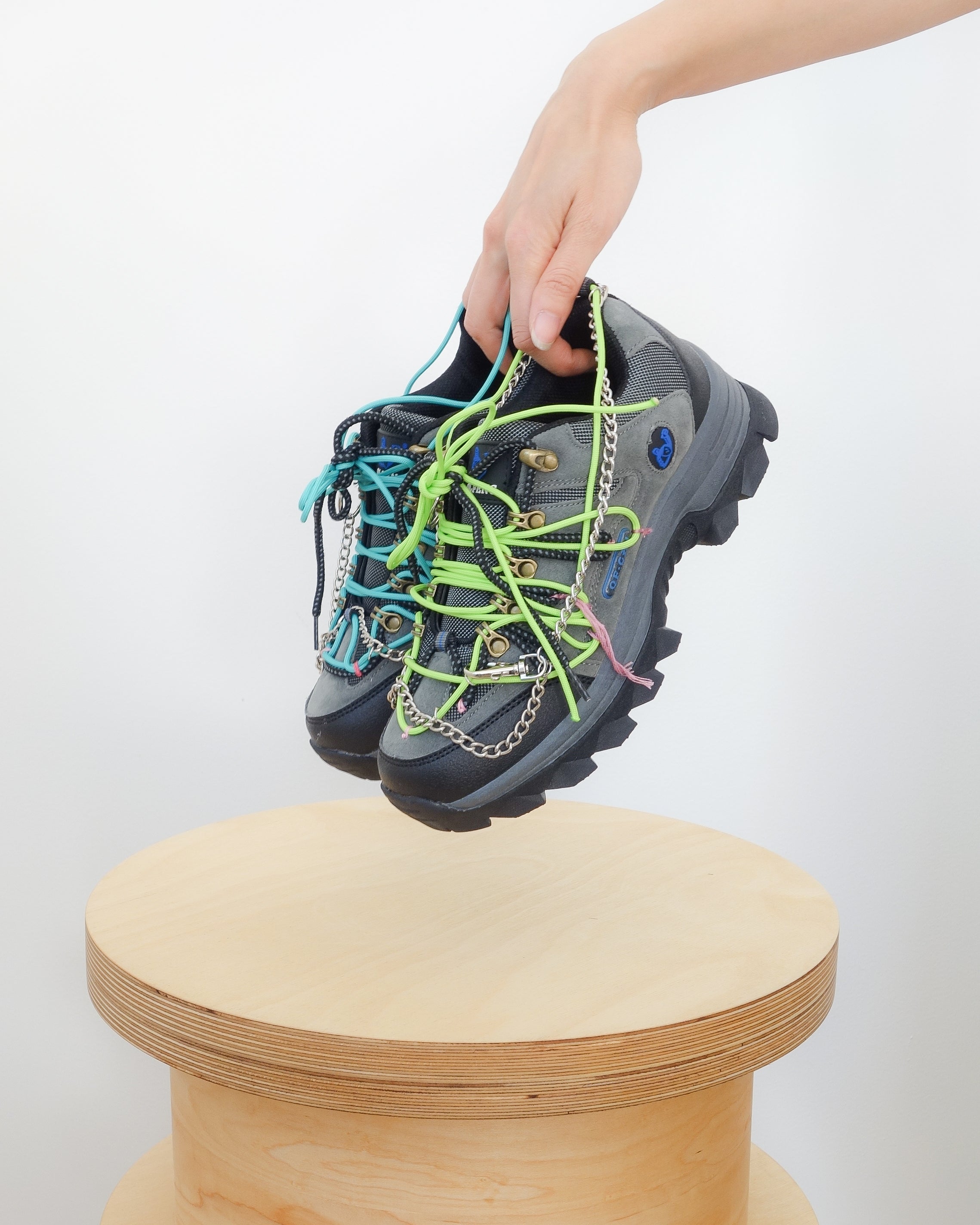 Yusho adds his signature knitting style, this time using long laces and chains to various nondescript brands of trail shoes. Ideal for hiking concrete trails ;)