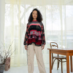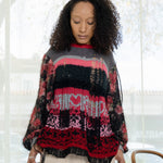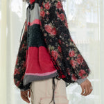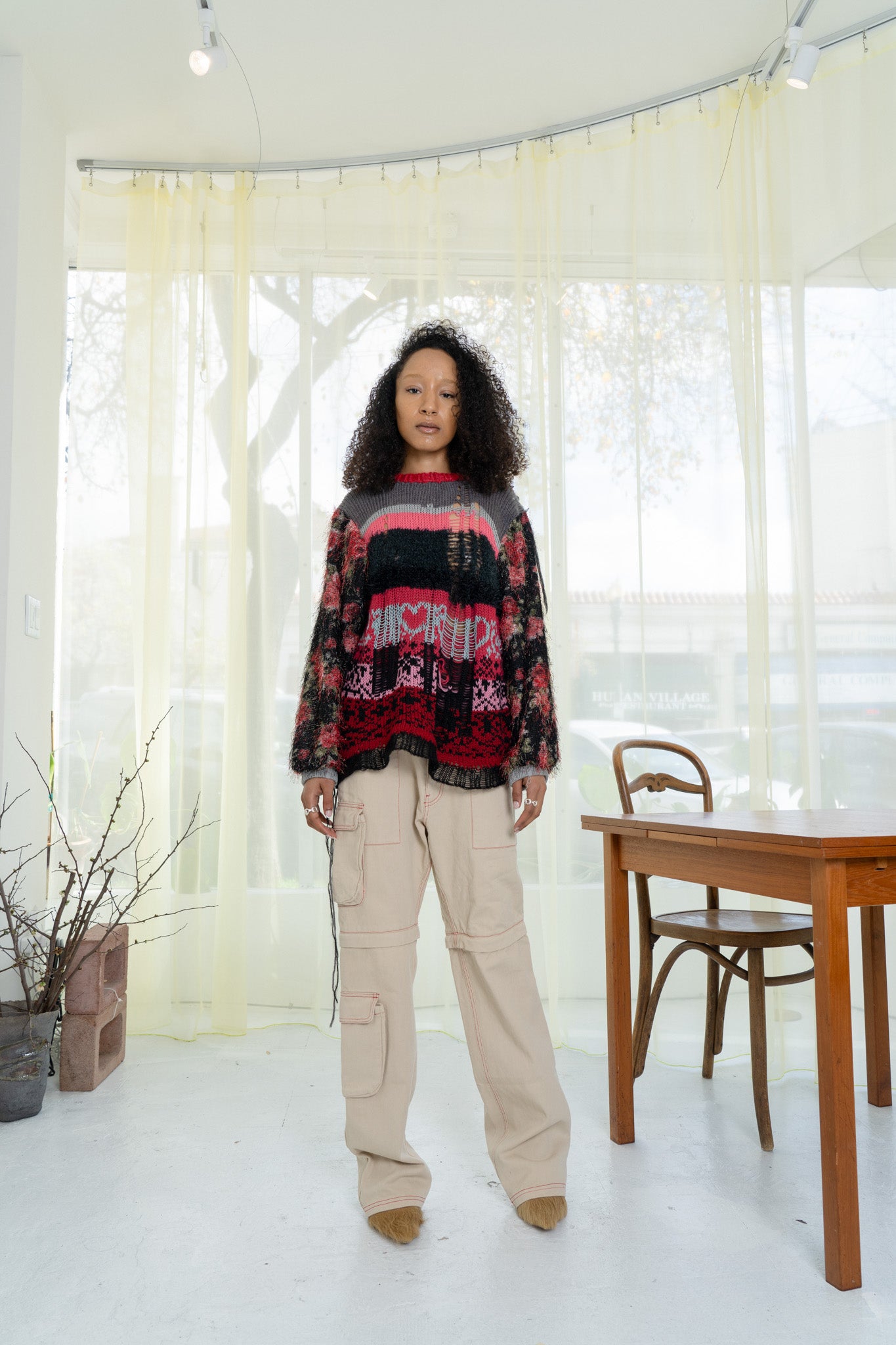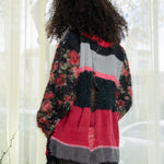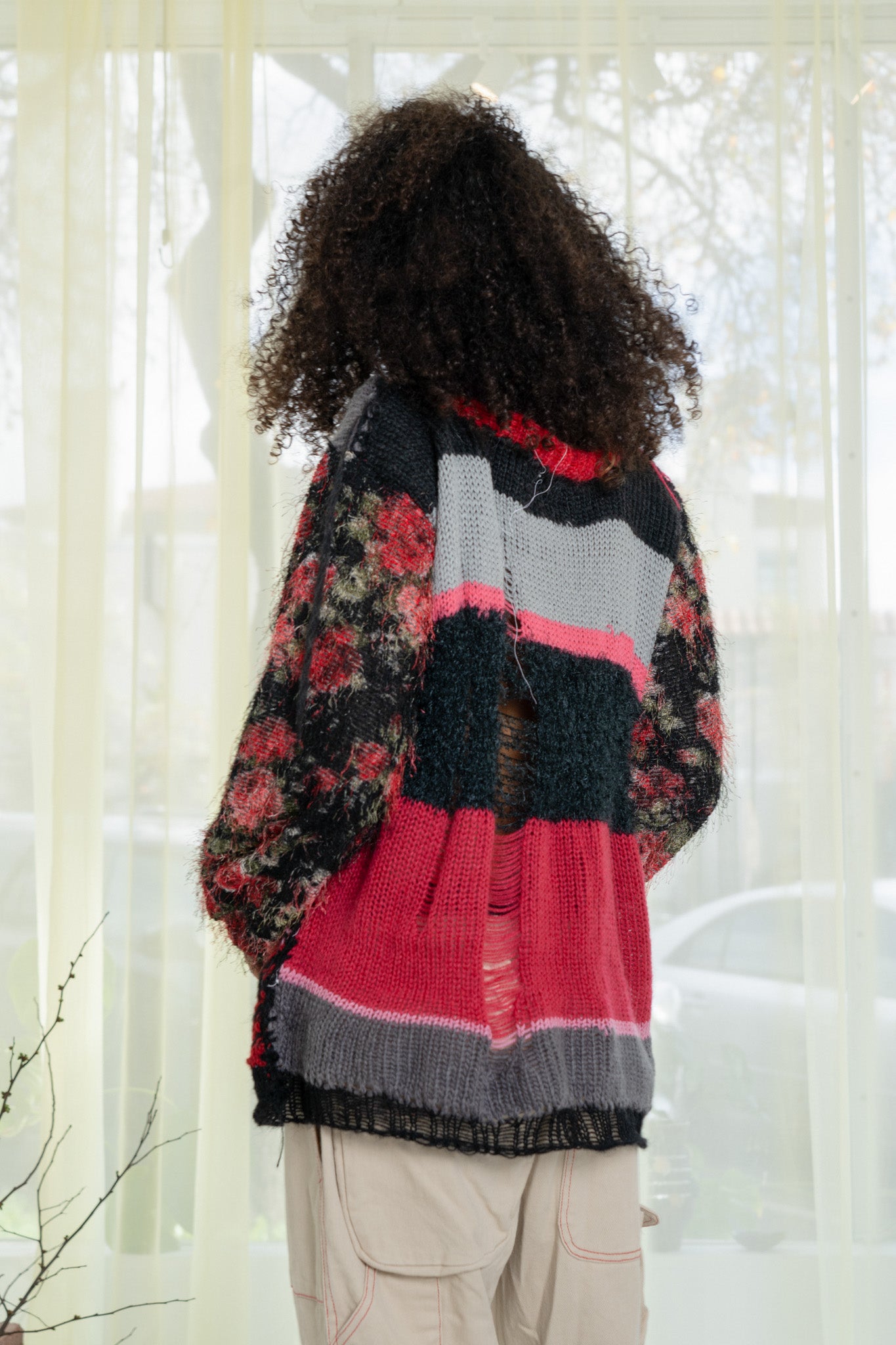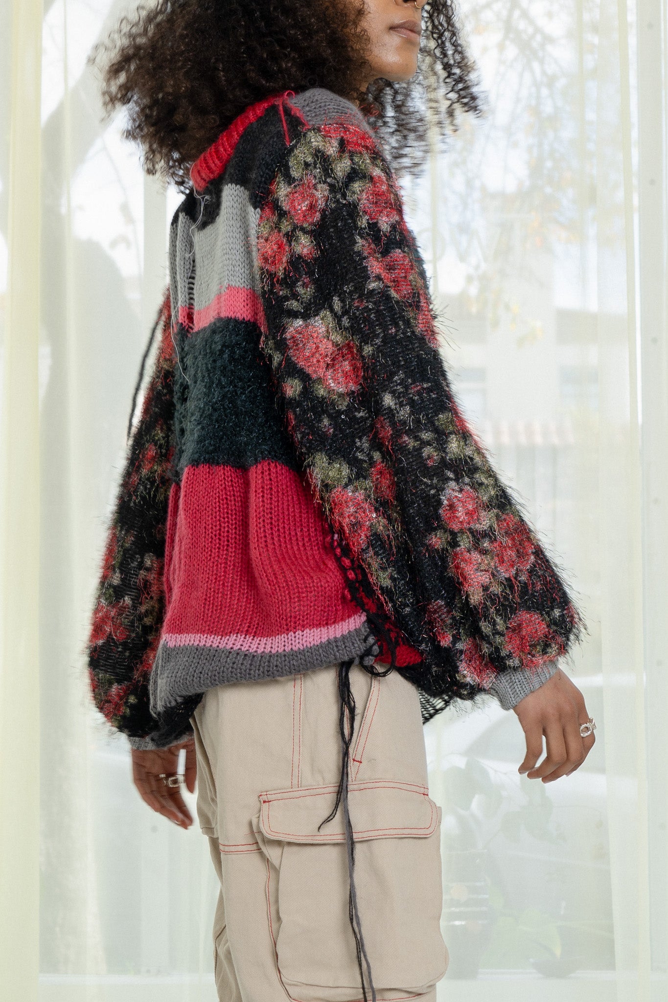 1/1 mixed knit sweater top in multi color stripe and floral pattern sleeves