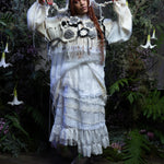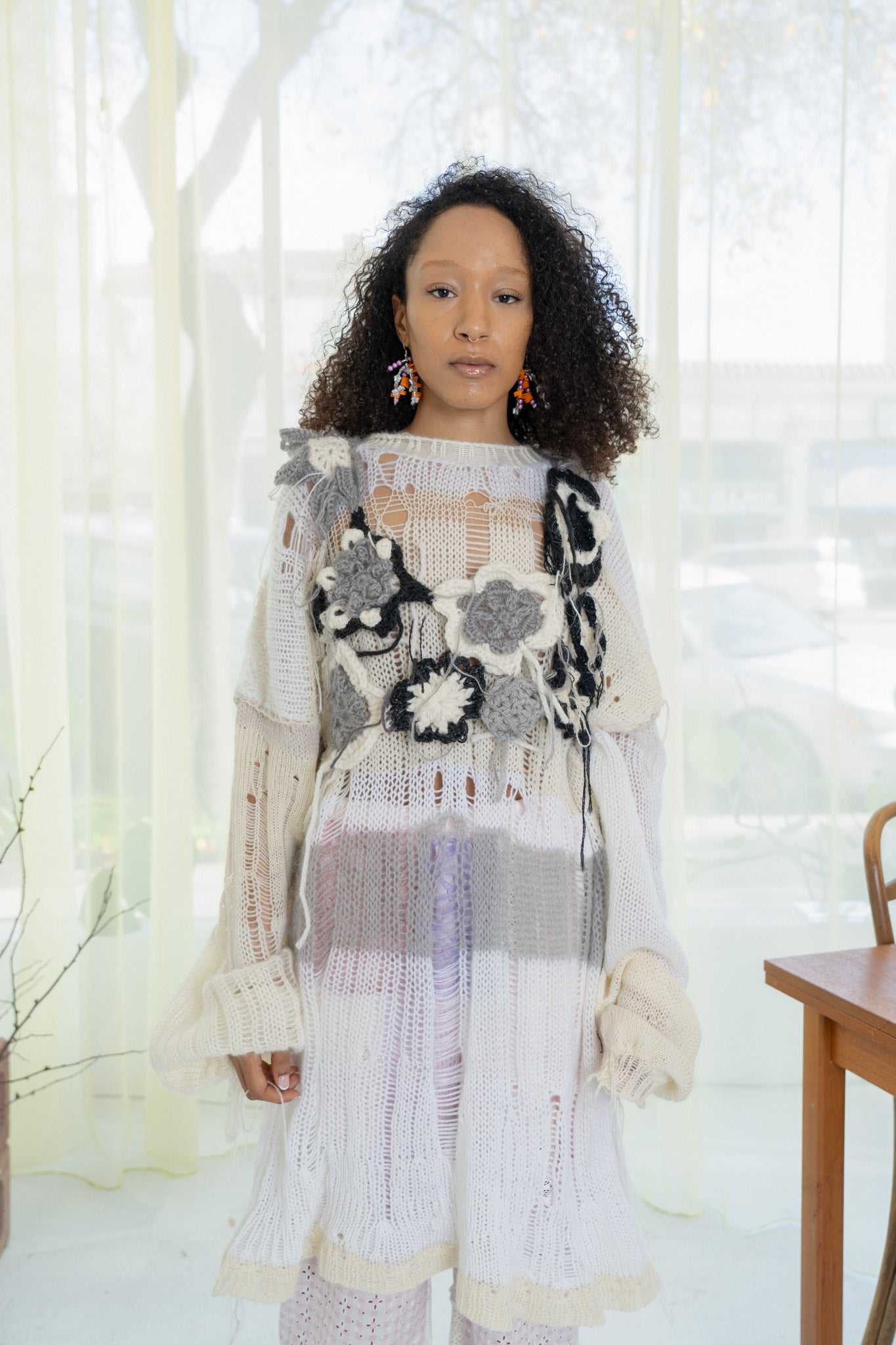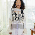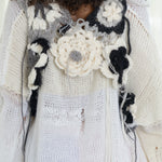 Crochet sleeveless top with mixed floral motif in black, white, grey