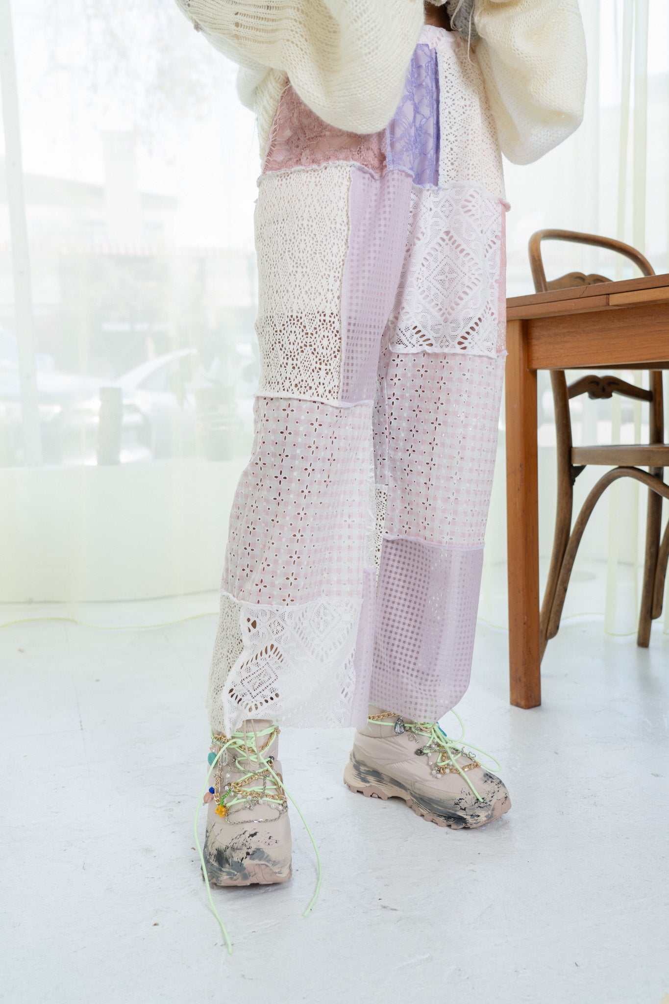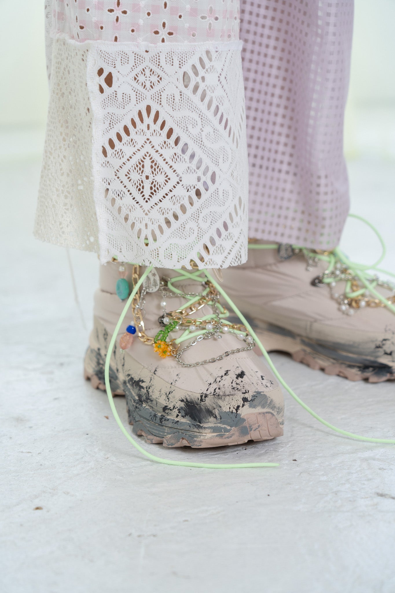 Customized nylon puff ankle boot featuring multi color shoelaces, beads, and chains.